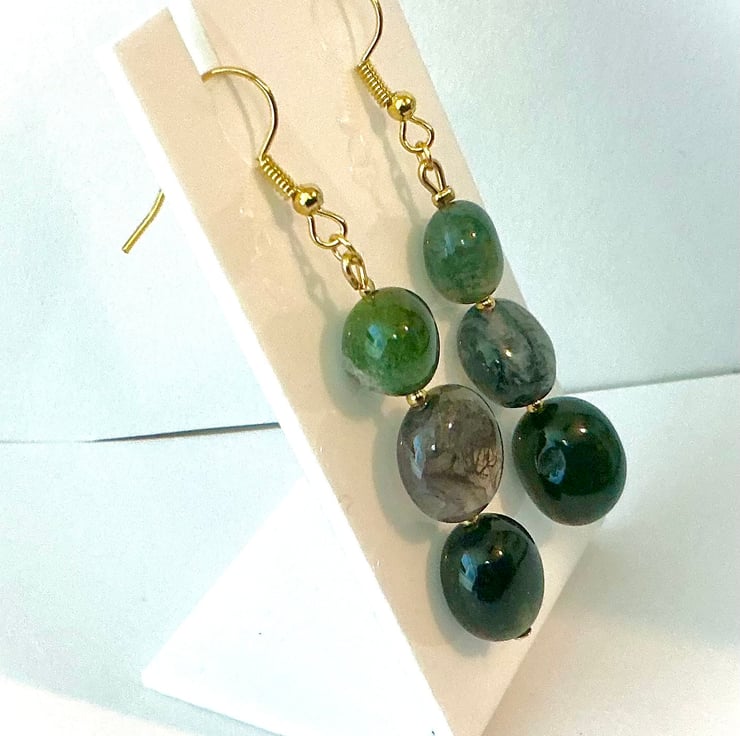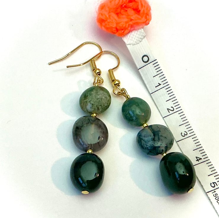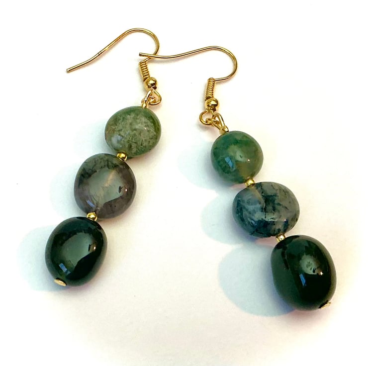 Triple beaded earrings made using a selection of dark Green moss agate stones on golden ear wires.