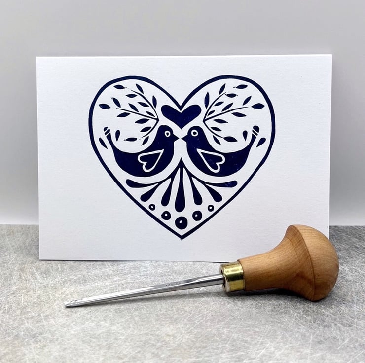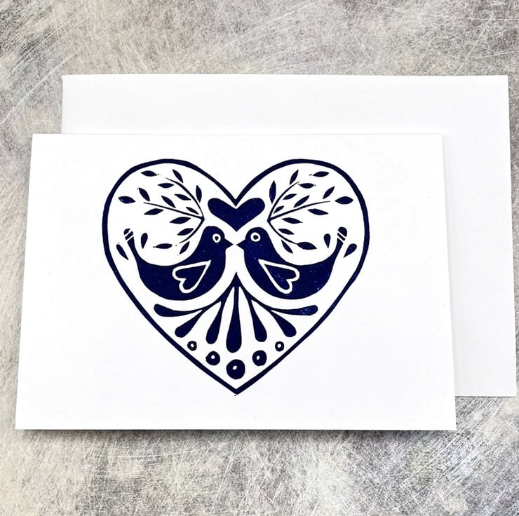Original Lino printed card of a love bird design within a heart. Hand printed using non toxic Prussian blue ink. Blank inside so can be used for any occasion.