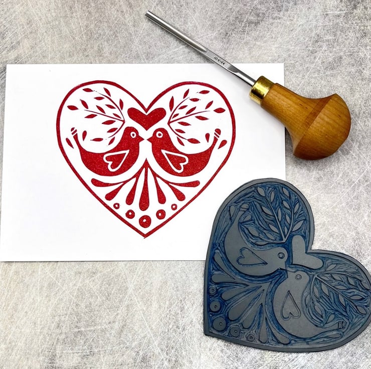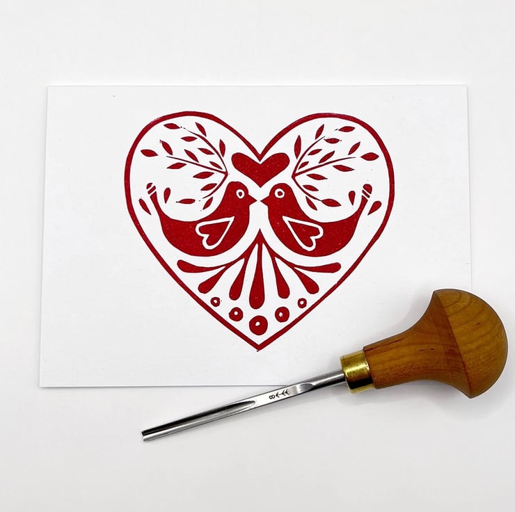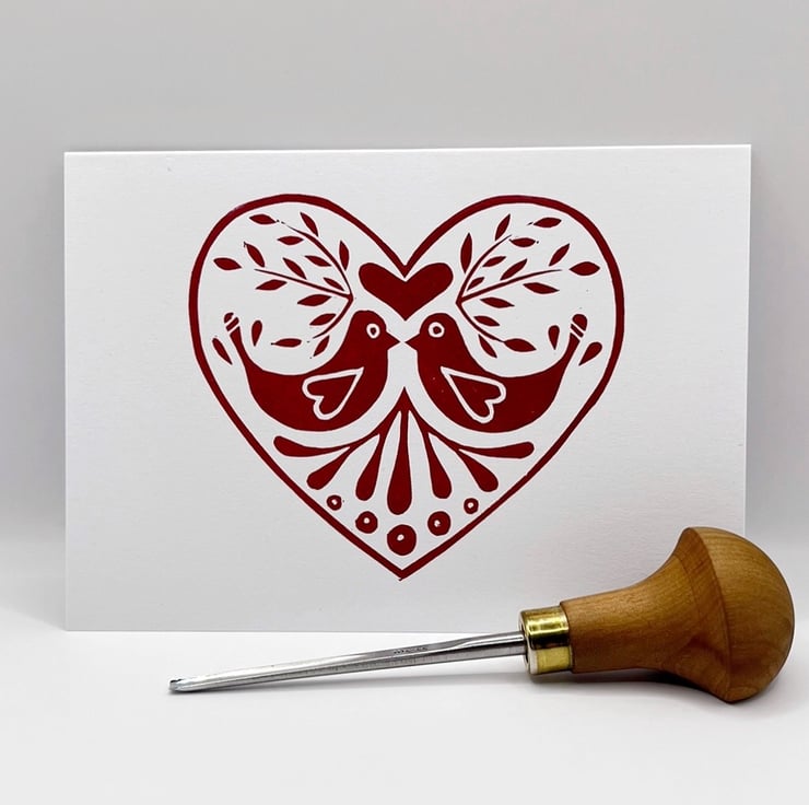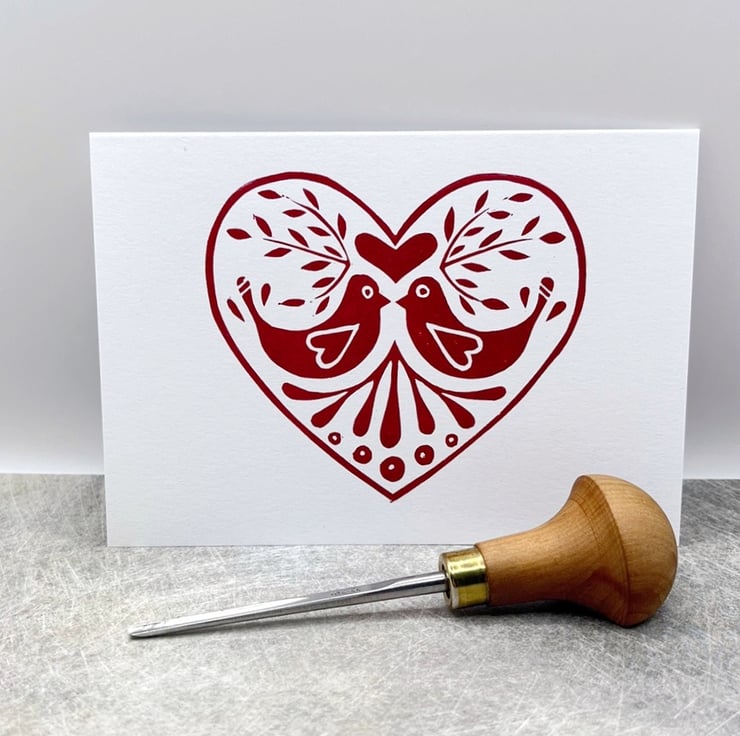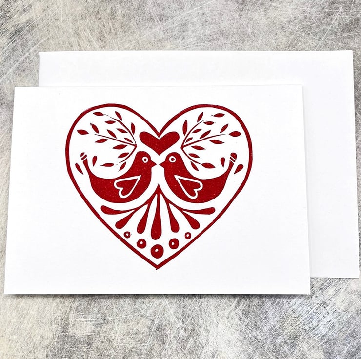 Original Lino printed card of a love bird design within a heart. Hand printed using non toxic red ink. Blank inside so can be used for any occasion.