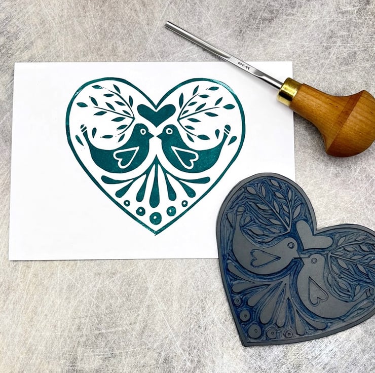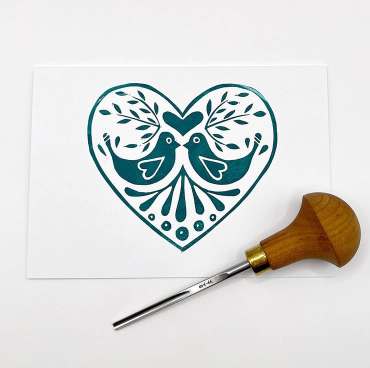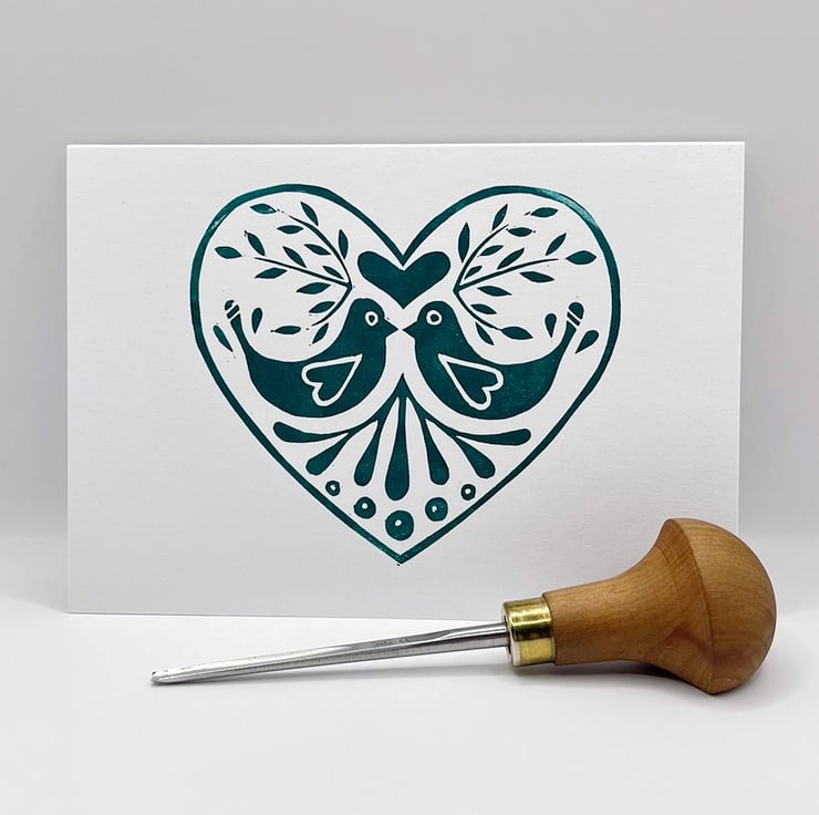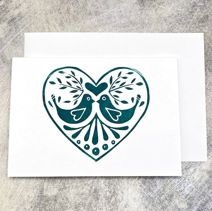 Original Lino printed card of a love bird design within a heart. Hand printed using non toxic green ink. Blank inside so can be used for any occasion.