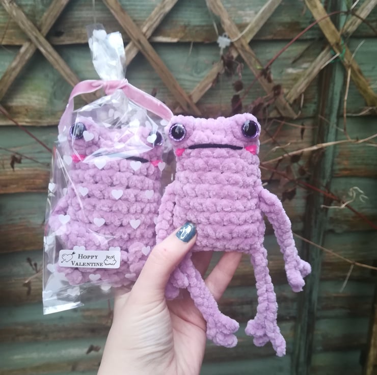 This stress frog is a limited edition Valentine's special made from a lovely pink fluffy yarn this one is so soft and cuddly. They also have special sparkly eyes in a selection of colours which you will receive a random one of.