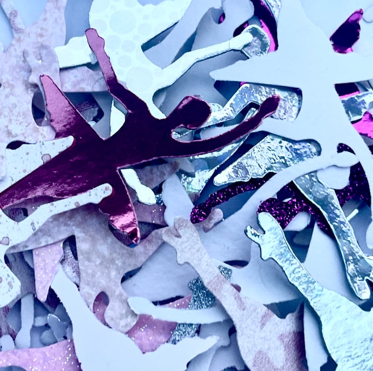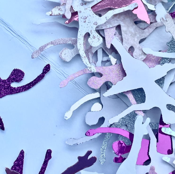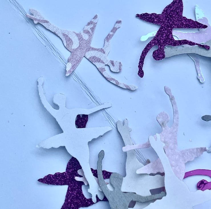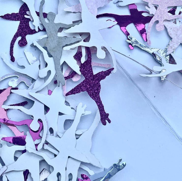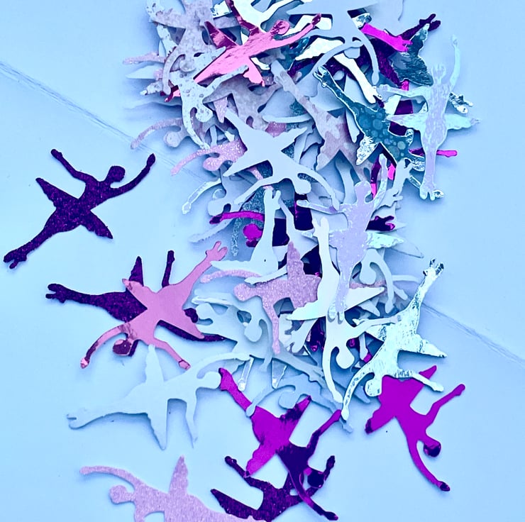 A craft embellishment or table confetti for the ballet lover. This bag of 5 grams of hand punched ballerinas are in pinks and silvers. The dancer is pirouetting in a tutu and comes in a variety of card type. There is glitter card, hand decorated card, mirror card, holographic card and patterned card in several shades of pink and silver. Each dancer is 4cm tall and 3.5cm wide. Each is hand punched, the weight is approximate but contains at least 5 grams. Ideal for crafting, card making, scrapbooking, upcycling and table confetti.