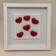 This piece features individual red glass hearts raised gently from a clean white background, creating a striking sense of depth and simplicity. Each heart is carefully shaped and kiln-fused so it sits slightly proud of the surface, catching the light and casting soft shadows that change throughout the day.
