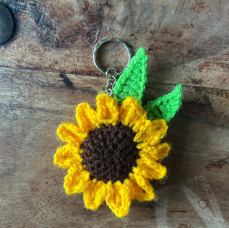 Add a little sunshine to your everyday essentials with this handmade crochet sunflower keyring bag charm. Carefully crocheted from soft wool, this cheerful sunflower features bright orange petals and two green leaves, making it a lovely pop of colour for bags, keys, backpacks or purses.
