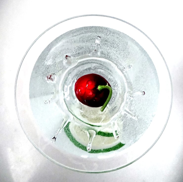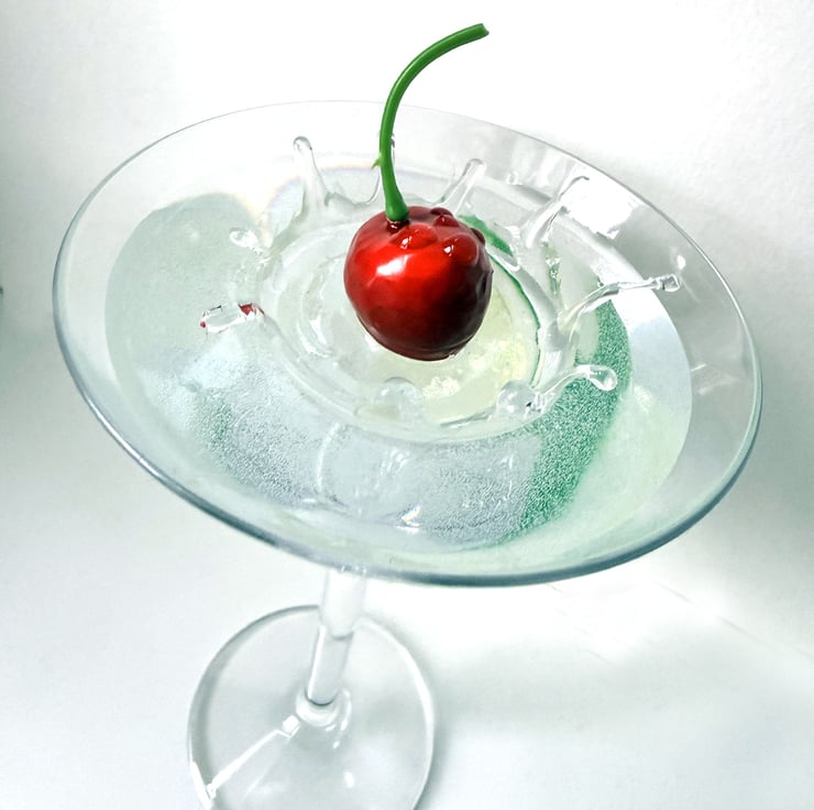 Full sized fake food art cocktail, in a polycarbonate safety glass with a highly realistic splash effect with fake cherry and lime slice.