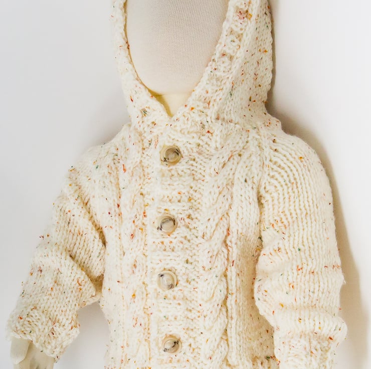 This cosy cardigan has a hood and buttons with cables along the front.