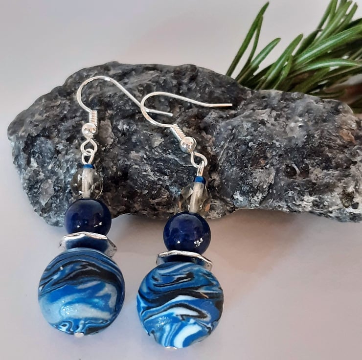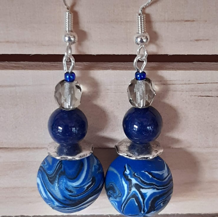 Distinctive handmade dangly earrings featuring polymer clay beads in bright blue, silver, white and black blended in a distinctive swirl design. Each bead is individually crafted, making every pair one of a kind.