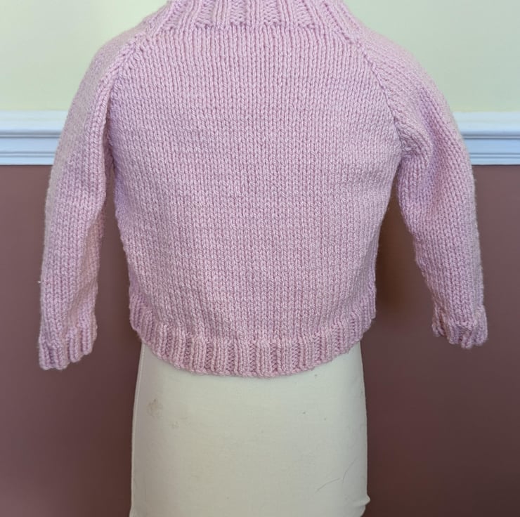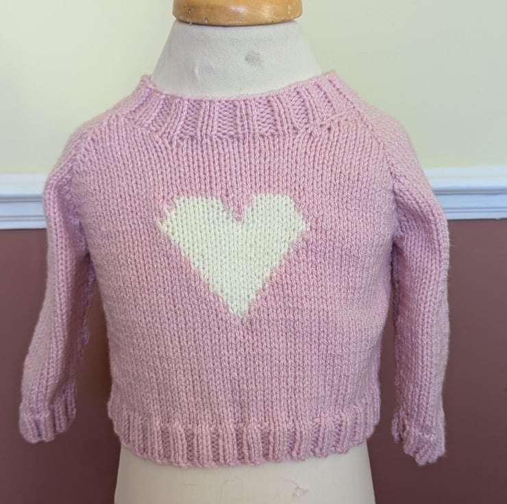 A cute hand knitted pink jumper with a white heart on the front. Ribbed round the bottom and top of the jumper. Also ribbing to be found on the end of the sleeve. Knitted by Tracey. Washable at 40 degrees. Knitted for a 0-9 month old. There is only one available and ready for sale