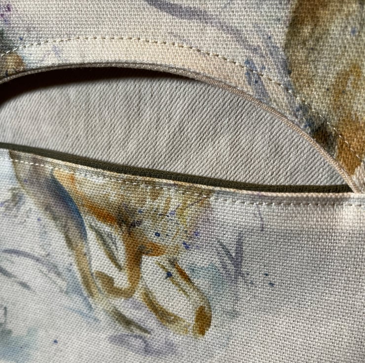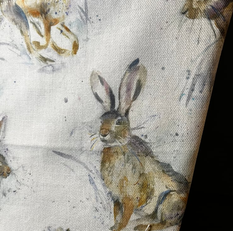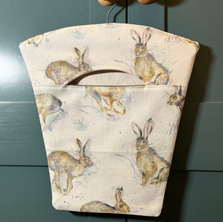 Peg bag made from pretty hare print with black cats on an orange background . I’ve combined it with a khaki textured fabric from a sample swatch and it is lined with more sample swatch fabric. It hangs from an old wood and metal coathanger.