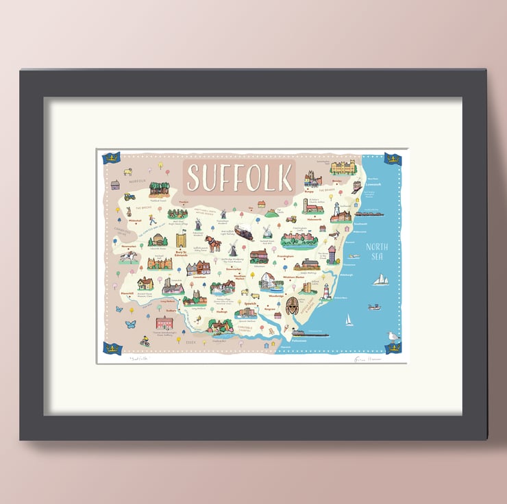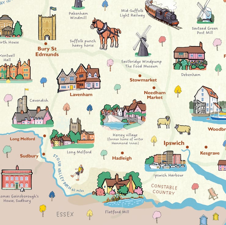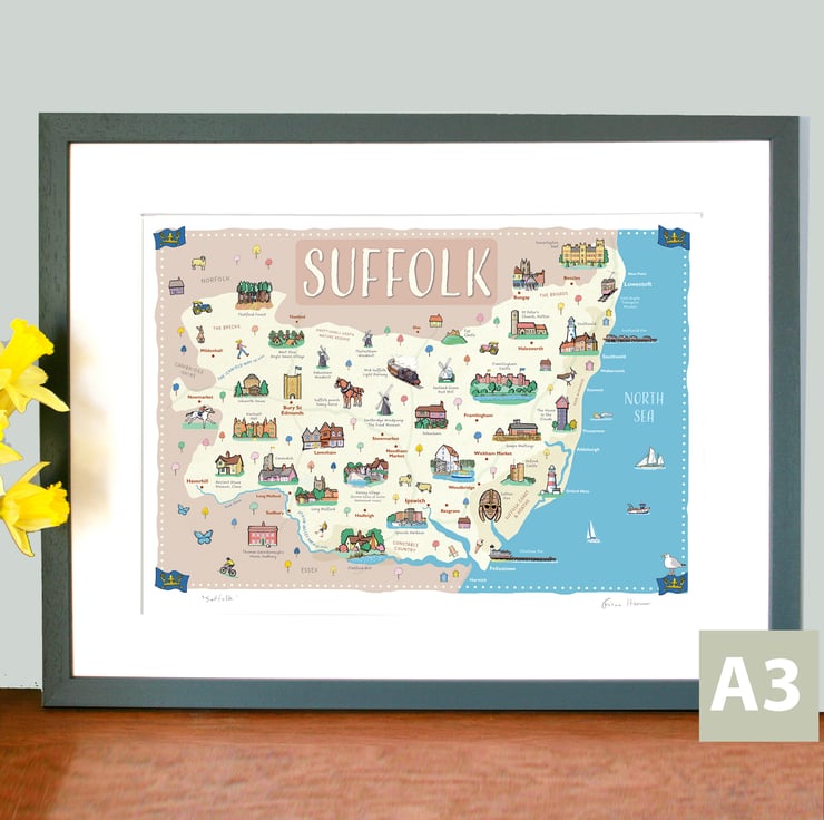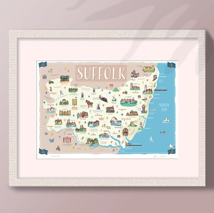 Beautiful illustrated A3 wall map of the English county of Suffolk.
