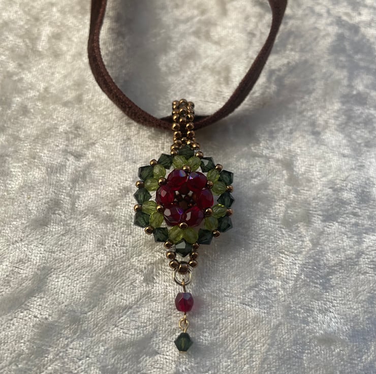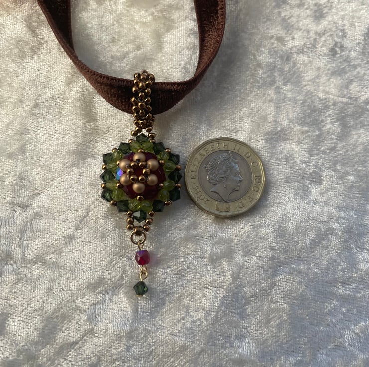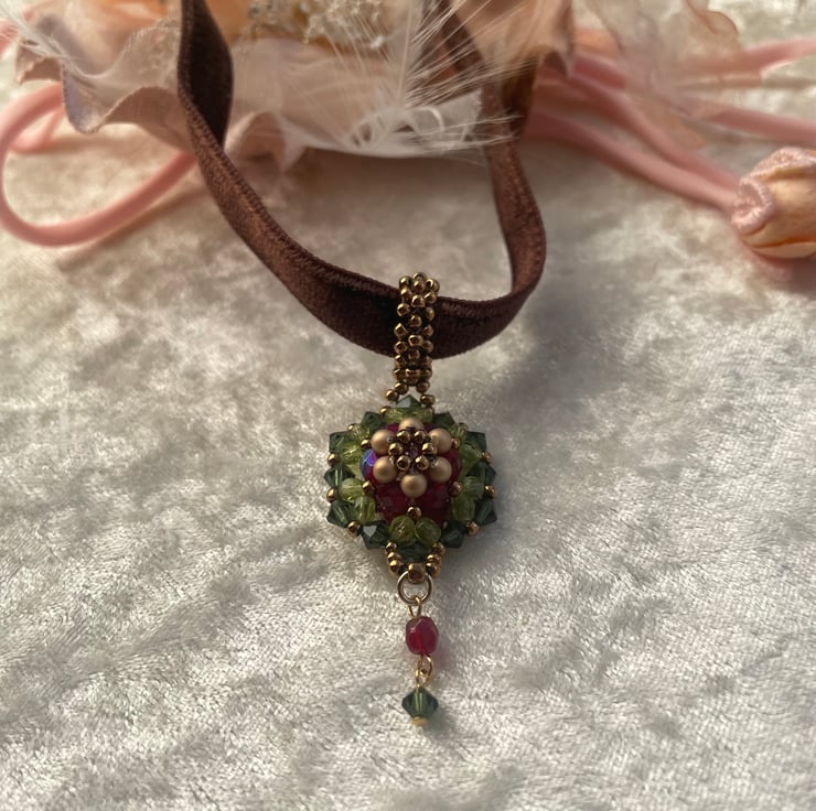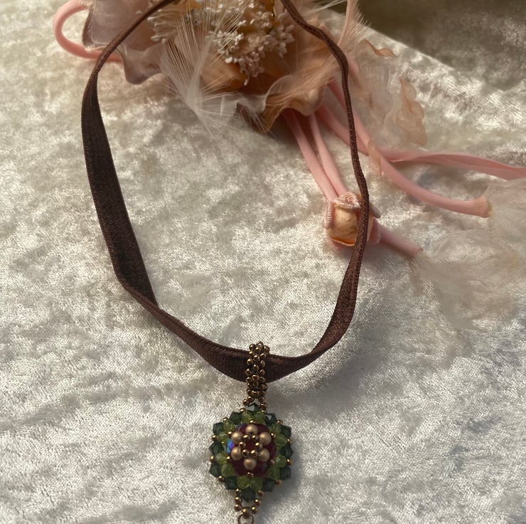 This brown velvet choker is a double faced with a beautiful beaded motif. The choker is a stylish and unique for any occasions. The motif is made with Swarovski crystals and Czech glass beads. 34cm long plus 5cm of extension.