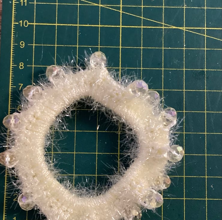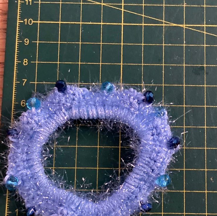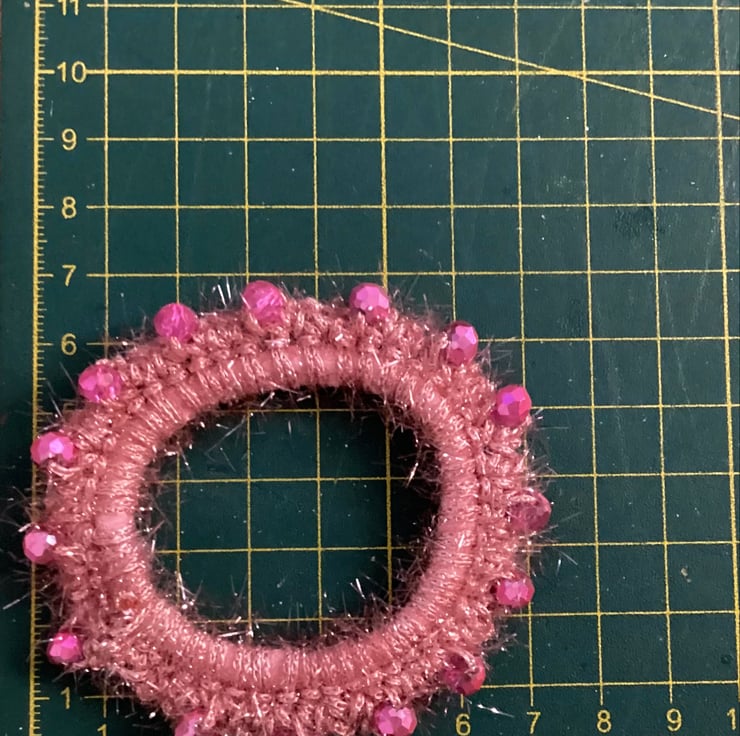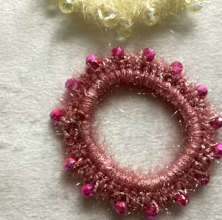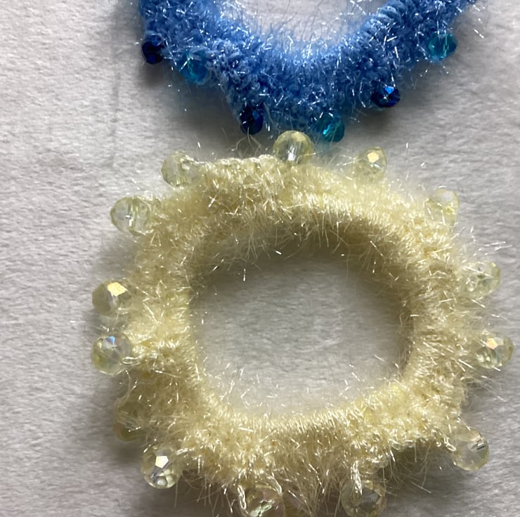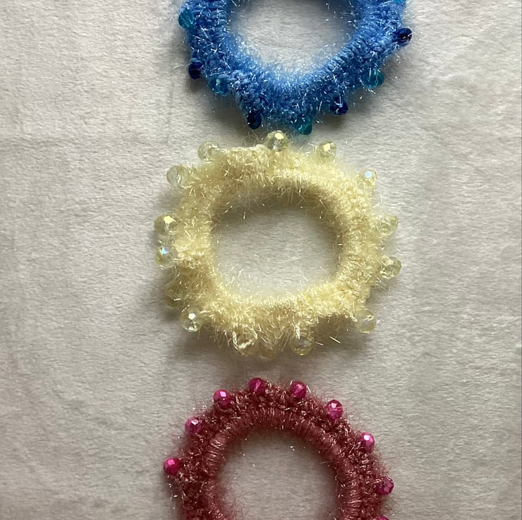 3 handmade ,crochet sparkly beaded ponytails by me in my home studio in West Midlands. Handcrafted crochet hair scrunchies with sparkly glass beads. Elastic band are wrapped crochet with glittering yarn. Round glass beads are beaded onto that wrapped hair elastic band. Dazzling under light.