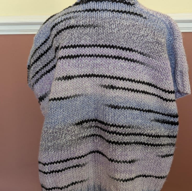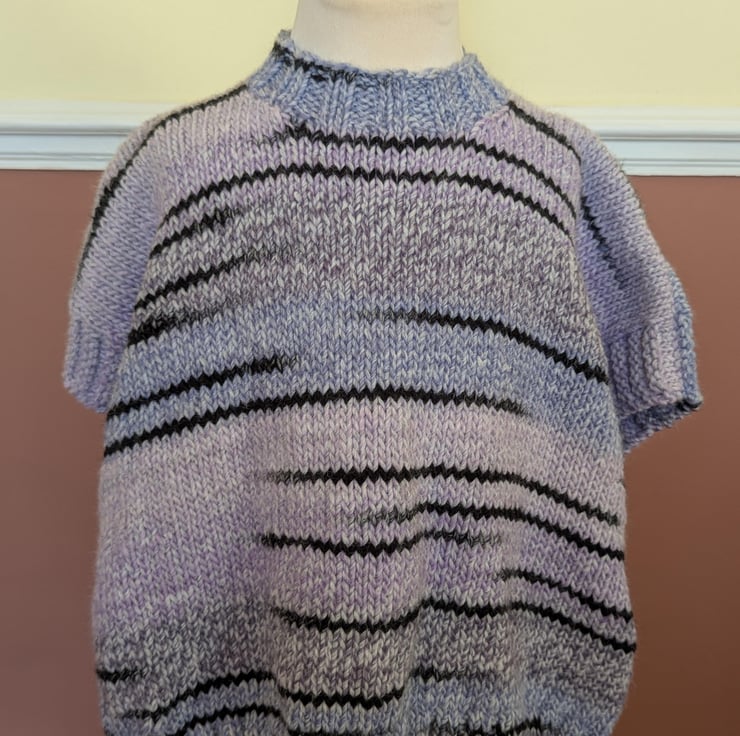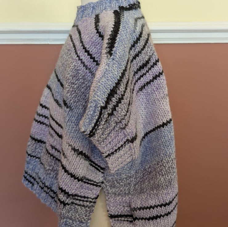Hand knitted jumper poncho from King Cole Safari range. Ribbed top and bottom and edge of sleeve. Lovely colour blends
