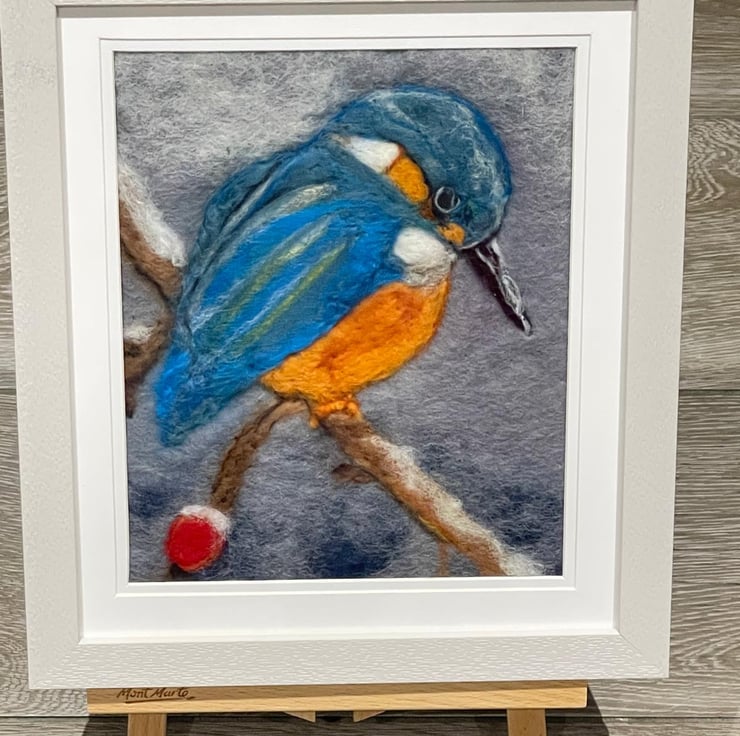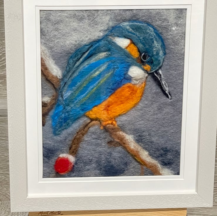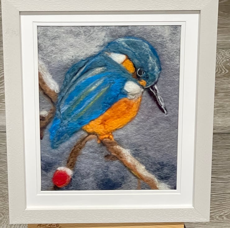 This kingfisher wool felting painting is a calm and thoughtful textile artwork, inspired by the gentle rhythms of the countryside. Carefully created by hand using both wet and needle-felted wool, the piece captures the stillness of a kingfisher at rest, its soft blues and warm tones standing out naturally against a belted background.