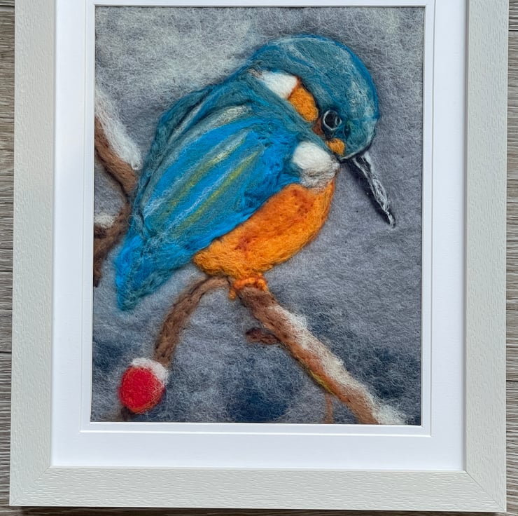 This kingfisher wool felting painting is a calm and thoughtful textile artwork, inspired by the gentle rhythms of the countryside. Carefully created by hand using both wet and needle-felted wool, the piece captures the stillness of a kingfisher at rest, its soft blues and warm tones standing out naturally against a belted background.