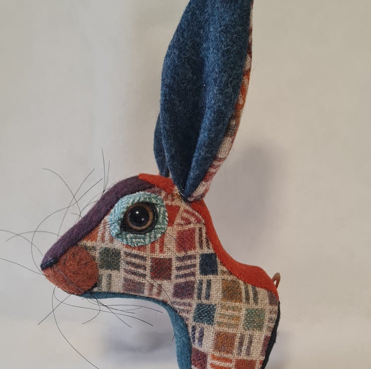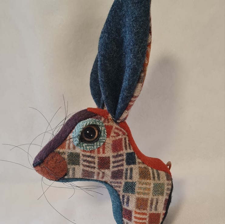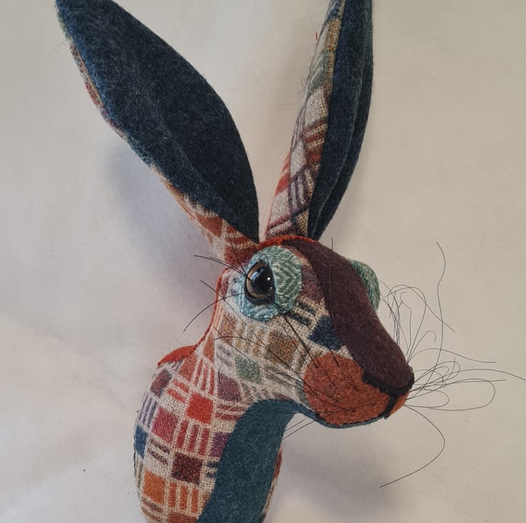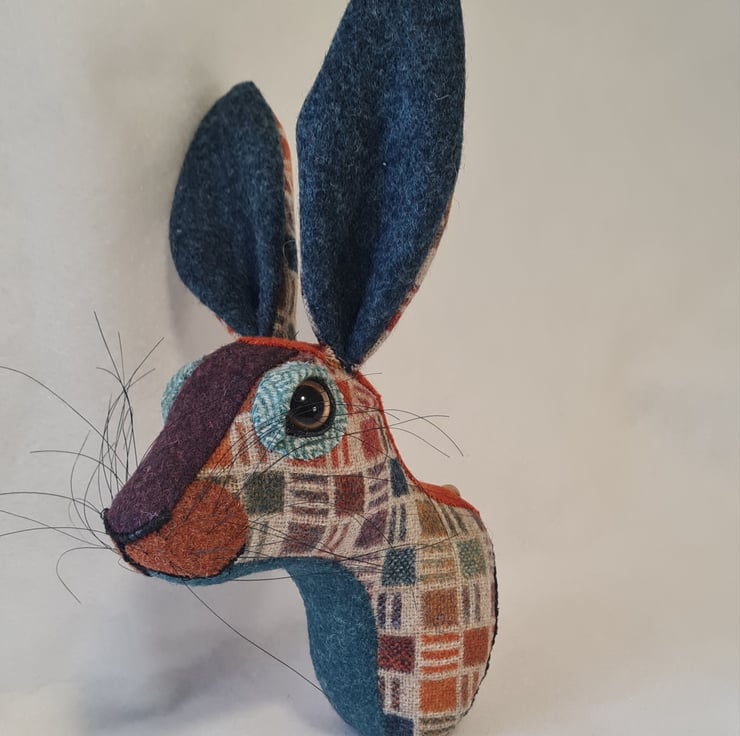 A lifesize faux hare which I have handmade and covered in hand stitched harlequin checked Abraham Moon wool. The head is backed with felt and has a metal hanger to hang it on the wall. It is lightweight.