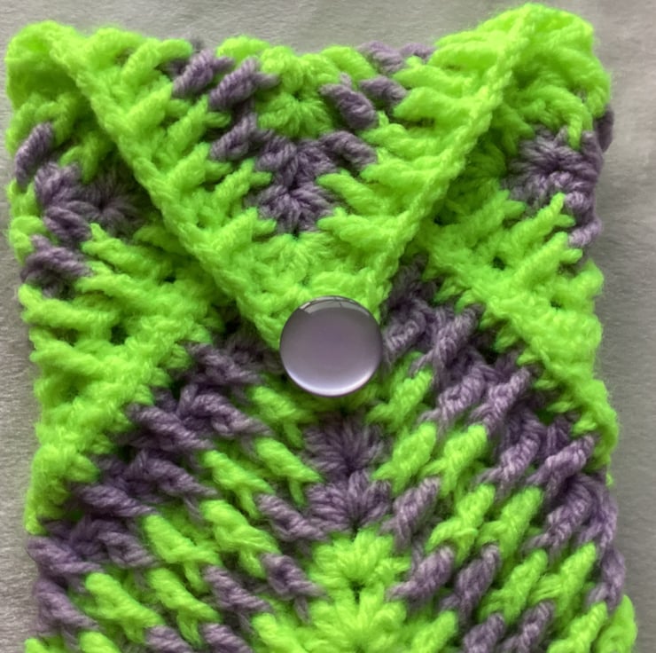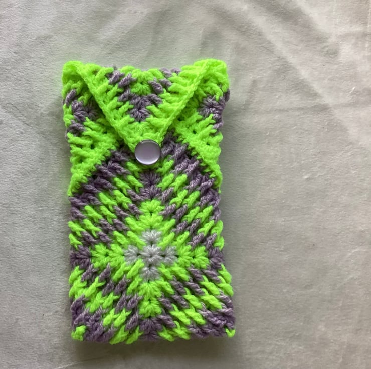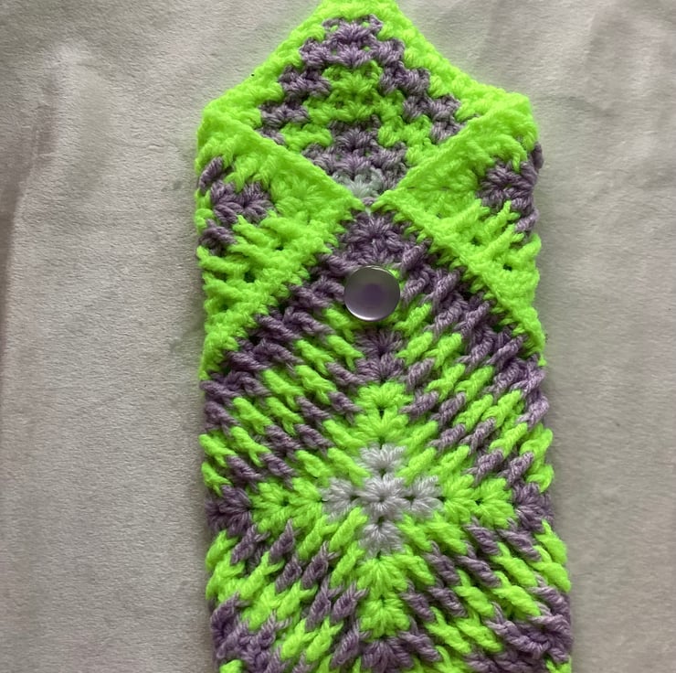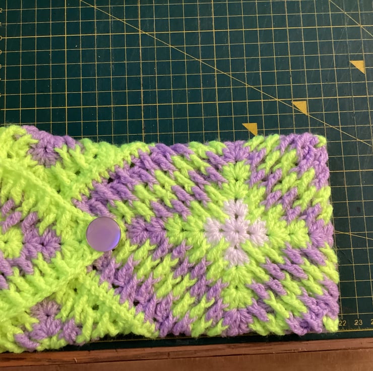 It’s a bright and colourful pouch made from crochet Granny Squares. I’ve used acrylic yarn and beautiful button.