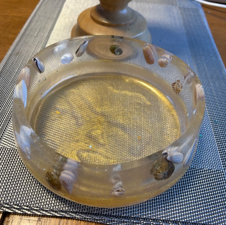 A beautiful bowl made with resin and inset with a range of shells. Clear and gold epoxy resin complements the theme. A lovely addition to any household and completely unique.