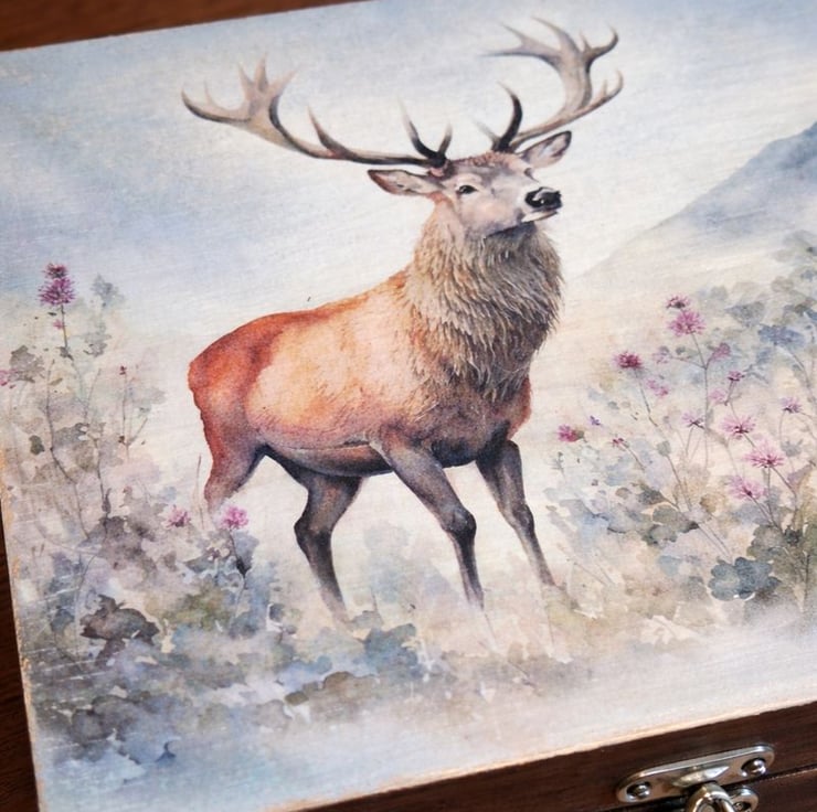 This wooden Chest has been Wood Stained & decorated with a lovely Highland Stag Scene.