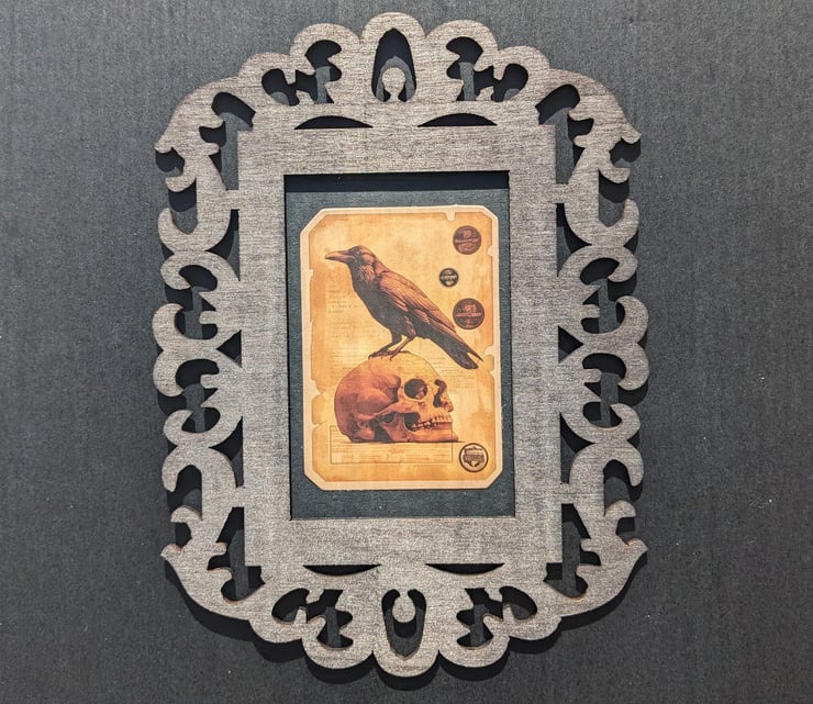 Ornate Wooden Frame with Skull and Crow Art – Gothic Wall Decor – 16cm x 12cm