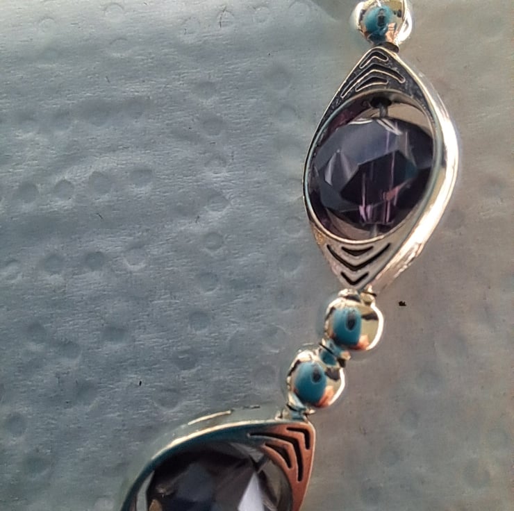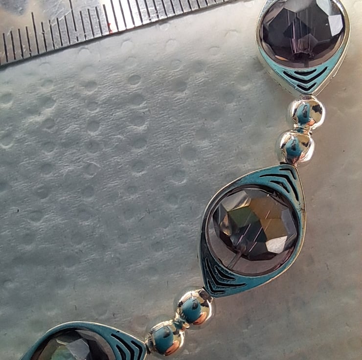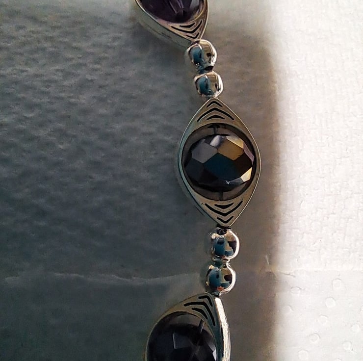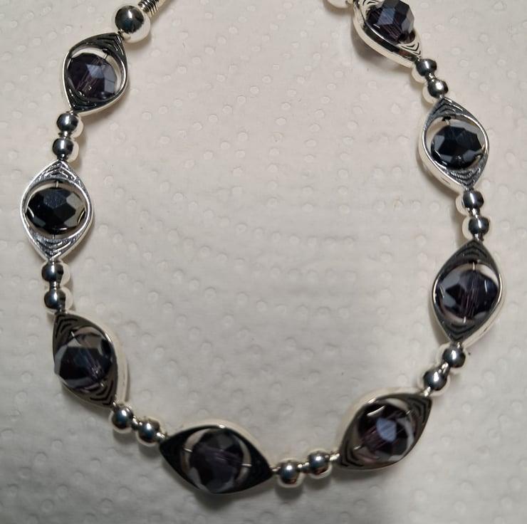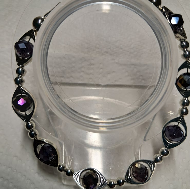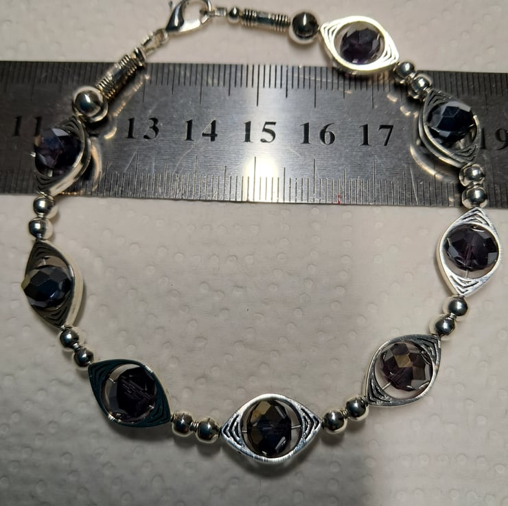 Link Beaded Bracelet with 8mm faceted Rondelles in Misty Lilac colour supported by engraved eye shaped links. 3mm silvertone spacer beads and Tibeten silver endings. Lobster claw fastener. Will fit up to 8" wrist. Handmade. Thankyou for looking. Lori