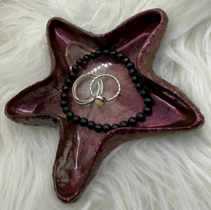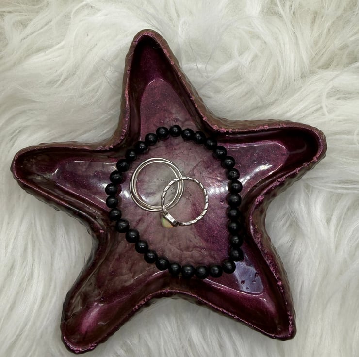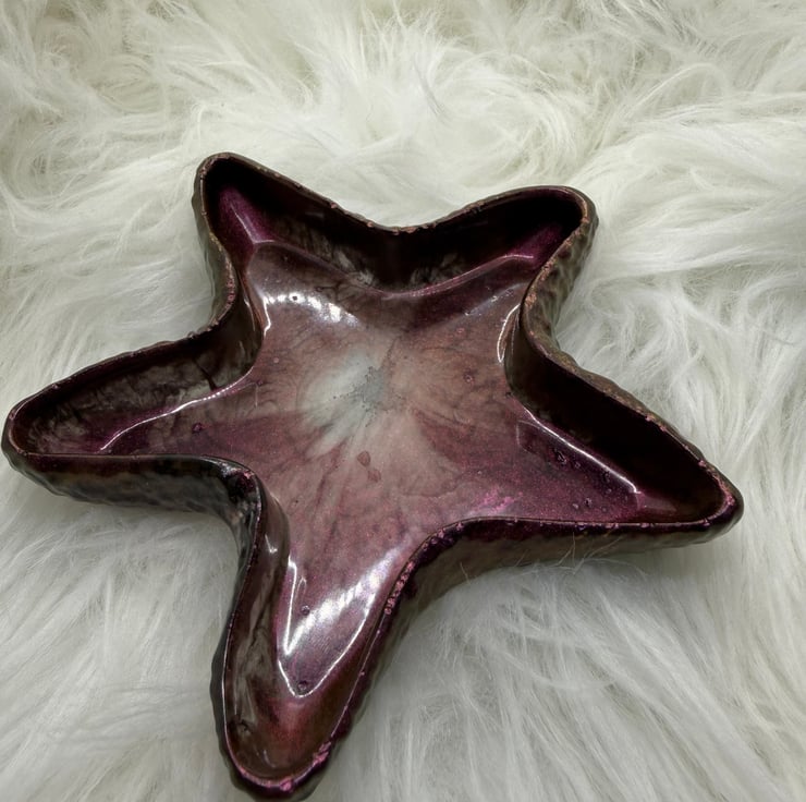 Starfish shaped jewellery or trinket tray made from resin with a metallic deep red and silver finish.