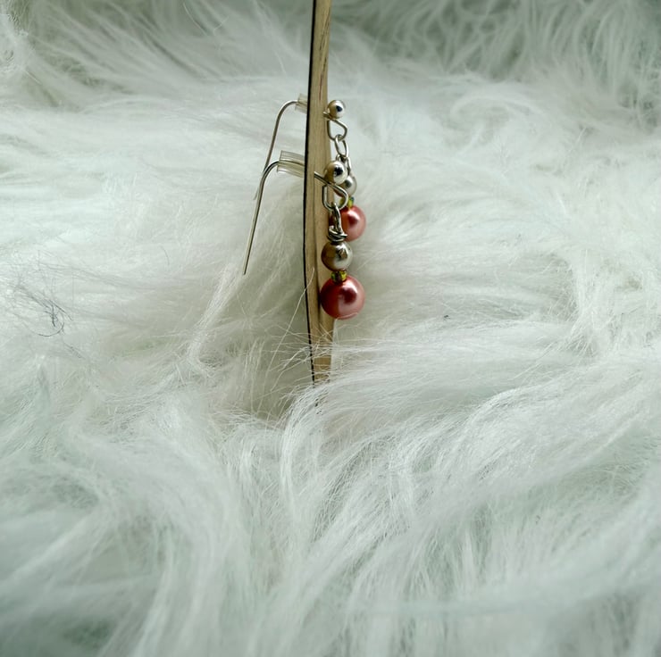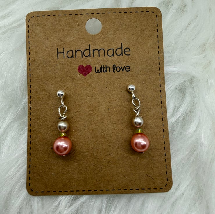 Beautiful pink and silver pearl dropper earrings with complimentary green glass beads. Handmade with love.