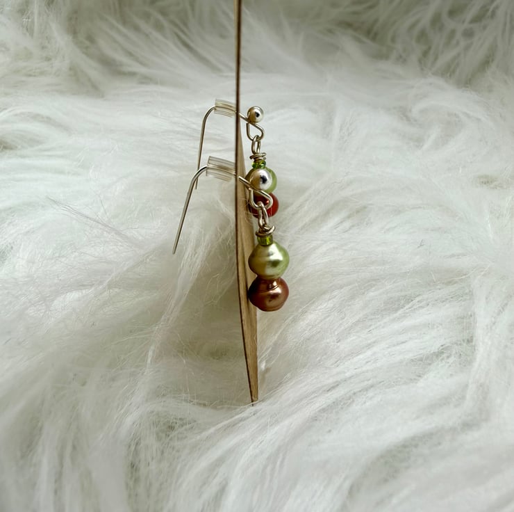 Handmade dropper earrings with green and red pearls with green glass beads.