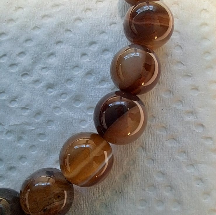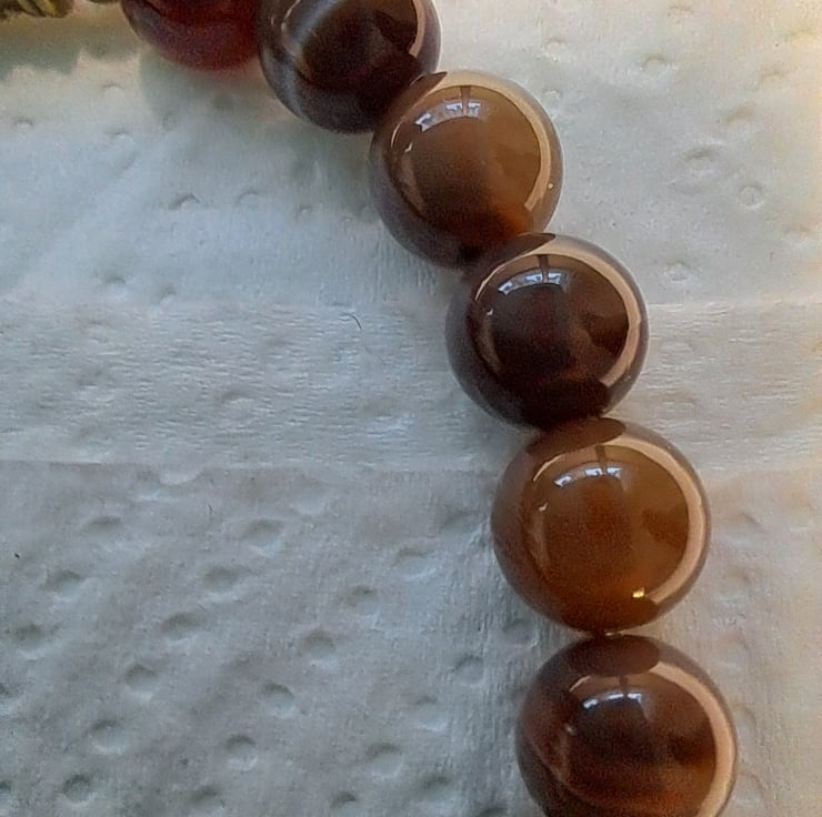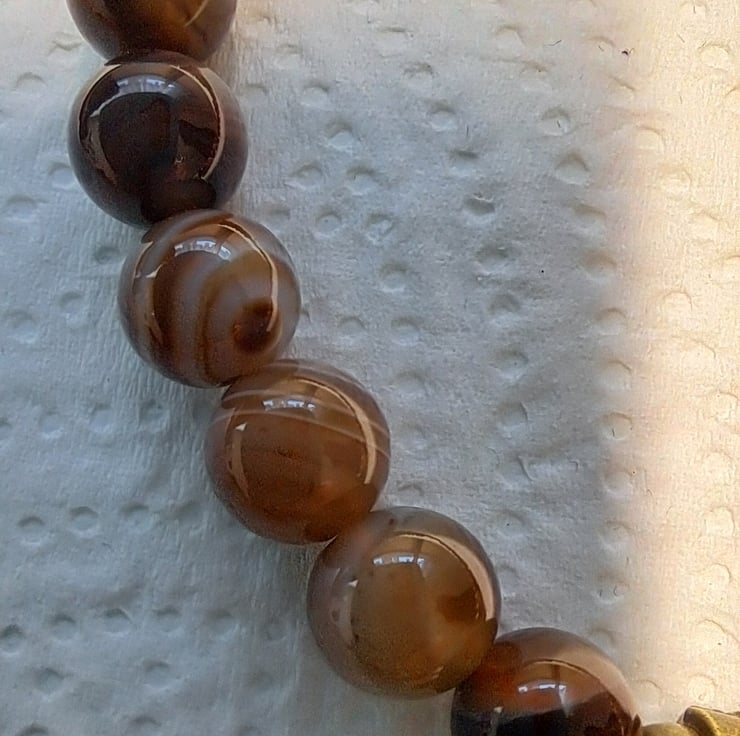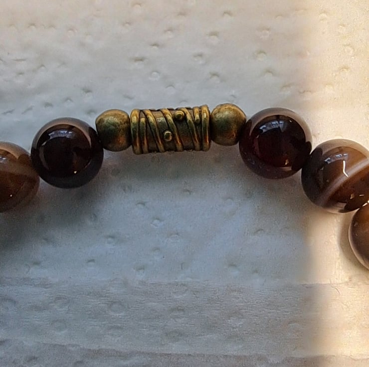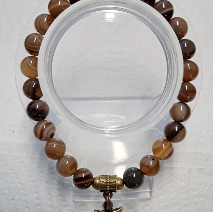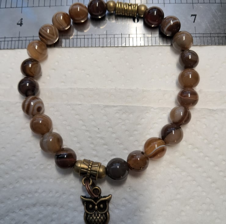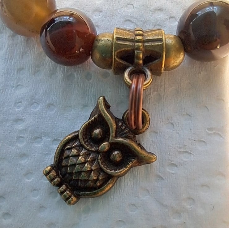 Natural Agate stretch beaded bracelet with 8mm Natural Agate beads in lovely coffee colours with Bronze tone spacers and beads. Double sided Owl charm. Will fit up to 71/2" wrist. Handmade. Thankyou for looking. Lori