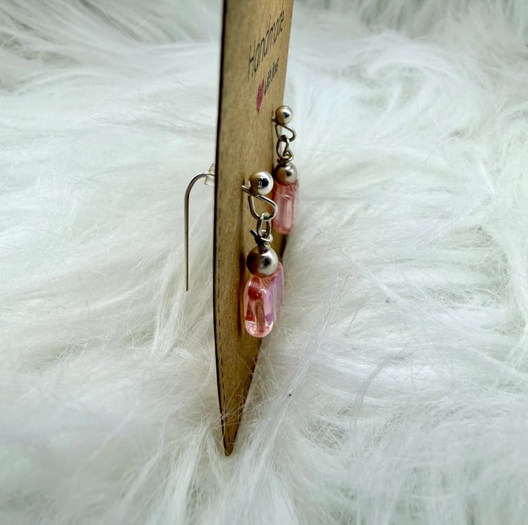 These beautiful glass beads are pink and shine in tones of pink, silver and purple as they move in the light.