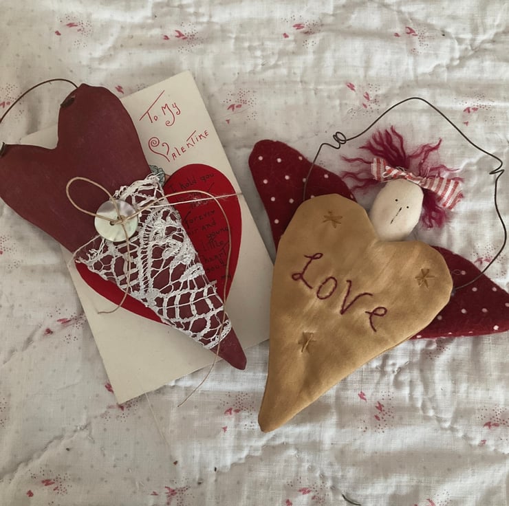 Homespun angel on a rusty tin wire hanger. The padded heart is hand embroidered with stars and ‘Love’. The wings are also padded. Painted features, blush cheeks, and red wavy wool hair finished with a homespun bow.