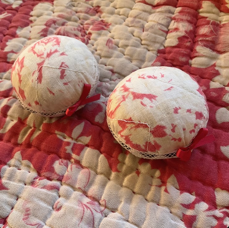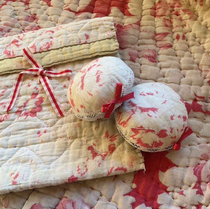 Each pin cushion is made from a piece of vintage quilt. Trimmed with antique lace and a silk ribbon bow.