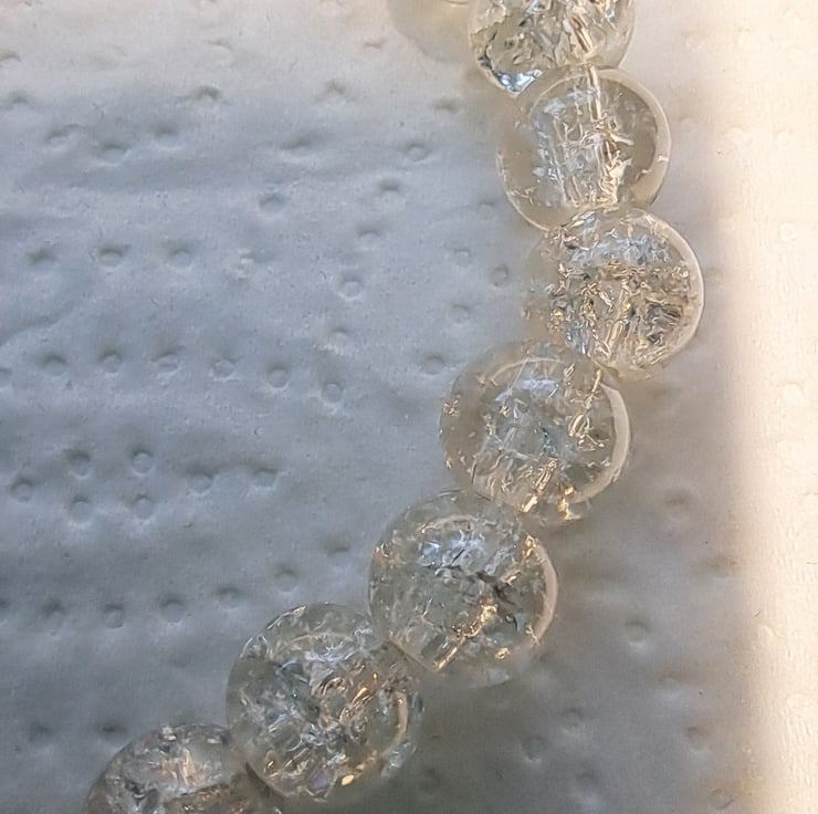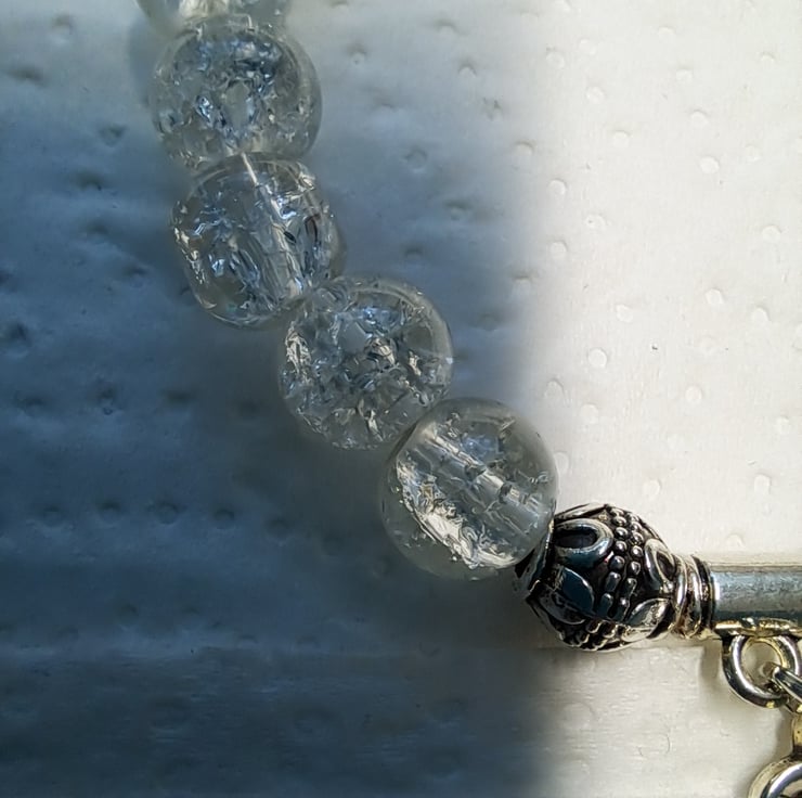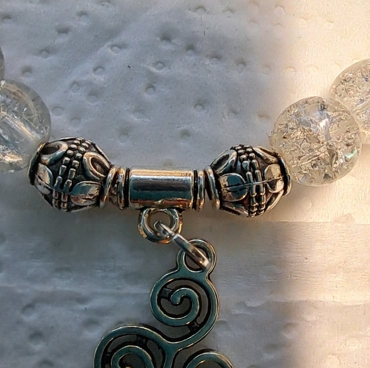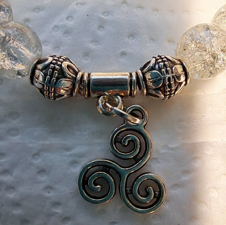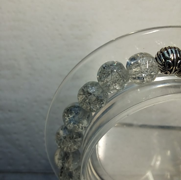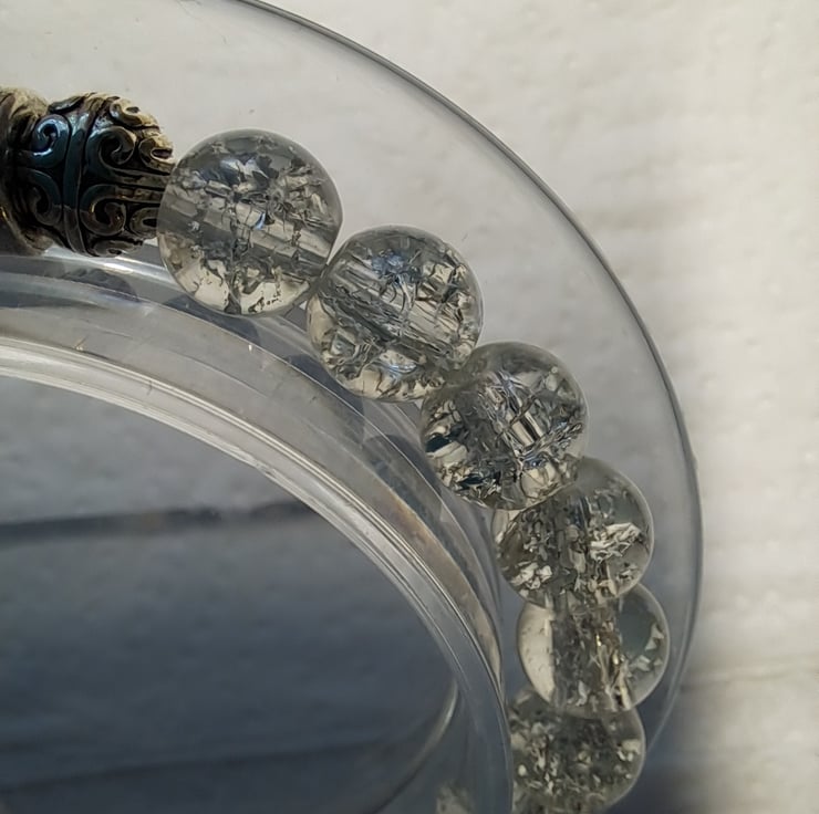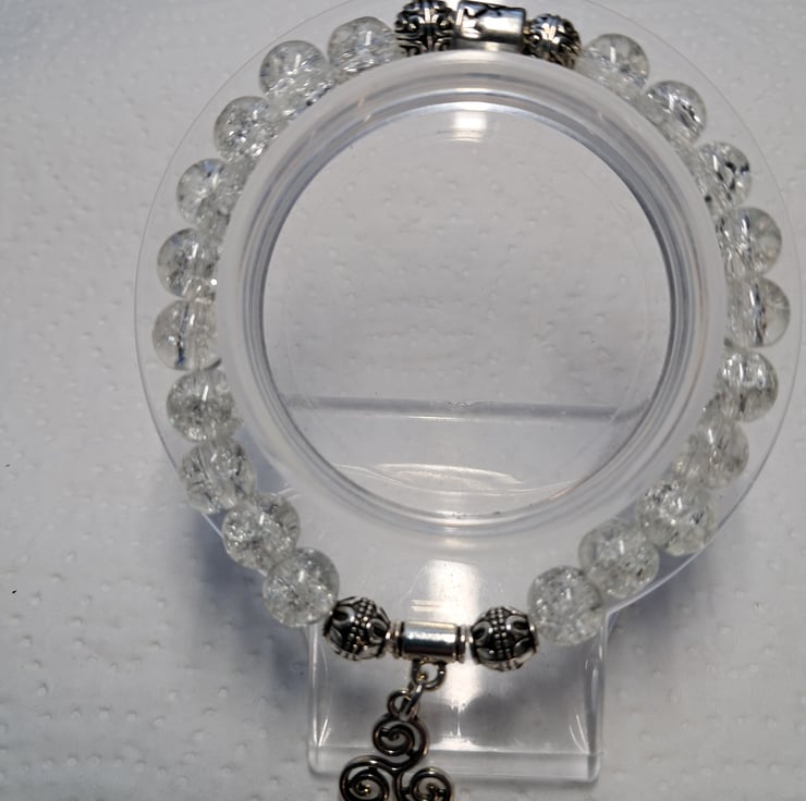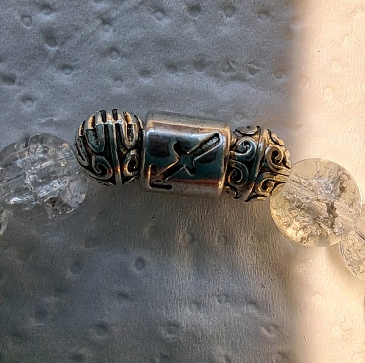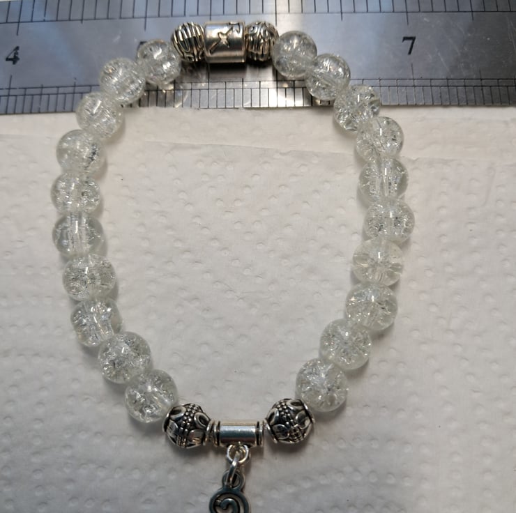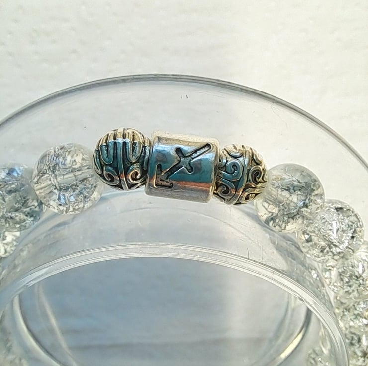 Crackle bead stretch bracelet with 8mm round clear Crackle Beads, and Tibeten silver Sagittarius Zodiac tube bead, really different. Intertnal cracked glass effect. With Tibeten silver spacers, beadand endings. Also comes with Triple Swirl charm. Will fit up to 7.1/2" wrist. Handmade. Thankyou for looking. Lori
