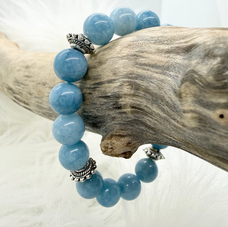 This beautiful bracelet has genuine aquamarine beads in stunning shades of blue with metal spacers on a stretchy chord.