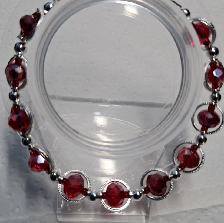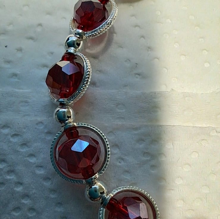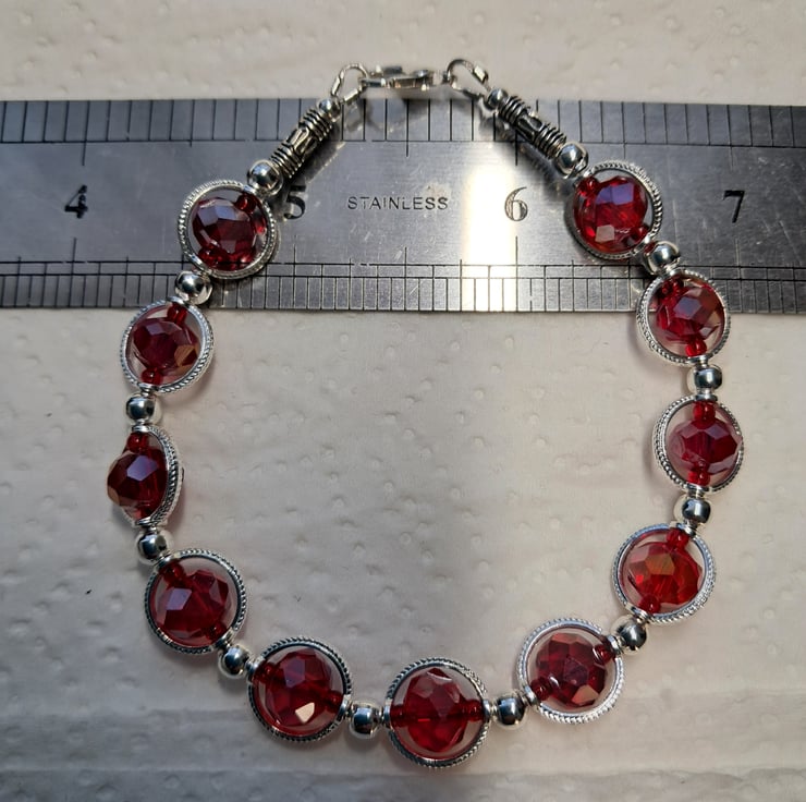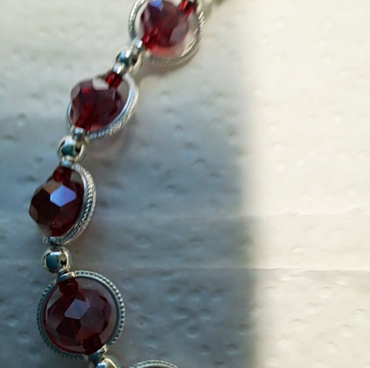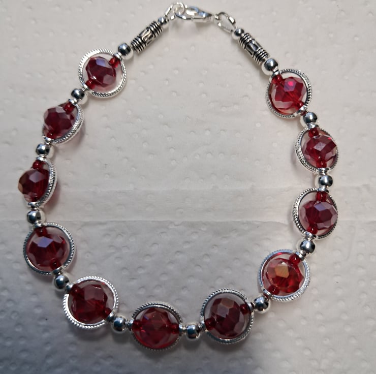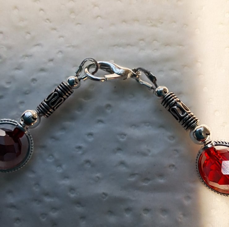 Link bracelet Deep Red faceted beads caught inside engraved links, 3mm silvertone spacers,Tibeten silver endings. Lobster claw fastener. Will fit up to 7.1/2" wrist. Handmade. Thankyou for looking. Lori