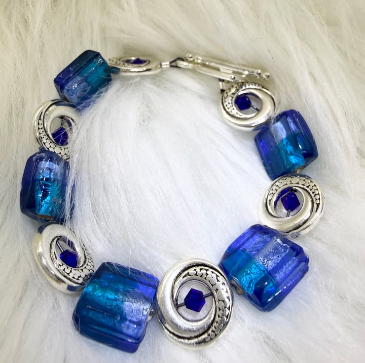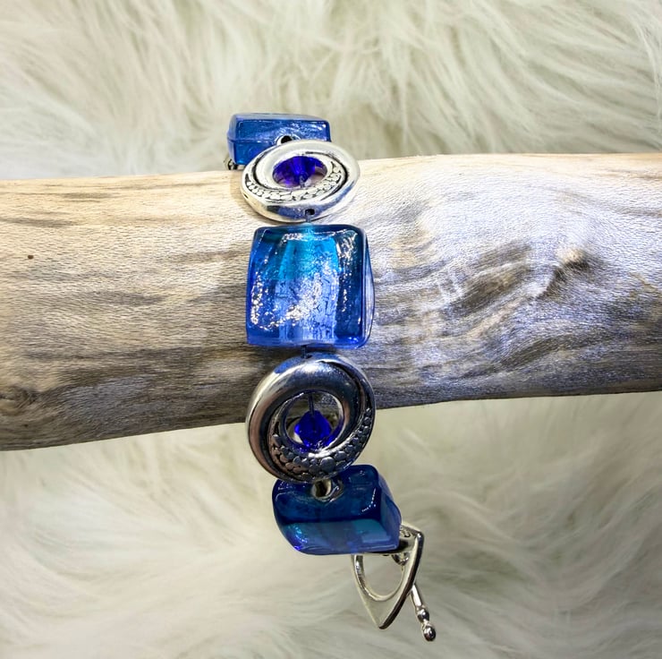 These striking blue and purple real glass beads are set on a wire with silver spacers and complimentary blue beads with a T-bar fixing.