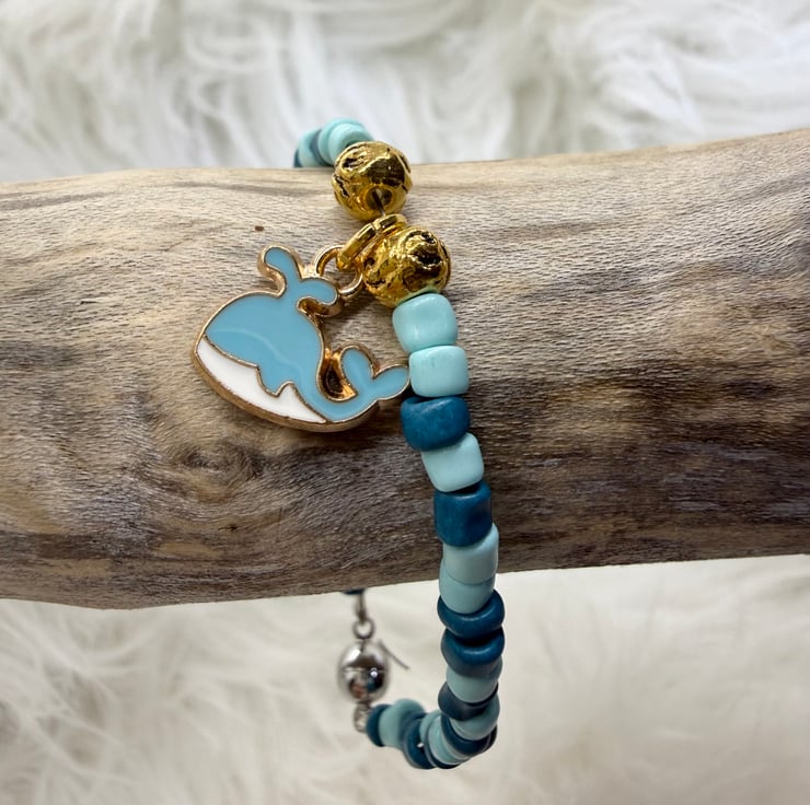 This cute little beaded bracelet has a magnetic clasp and a cute enamel finish whale charm.