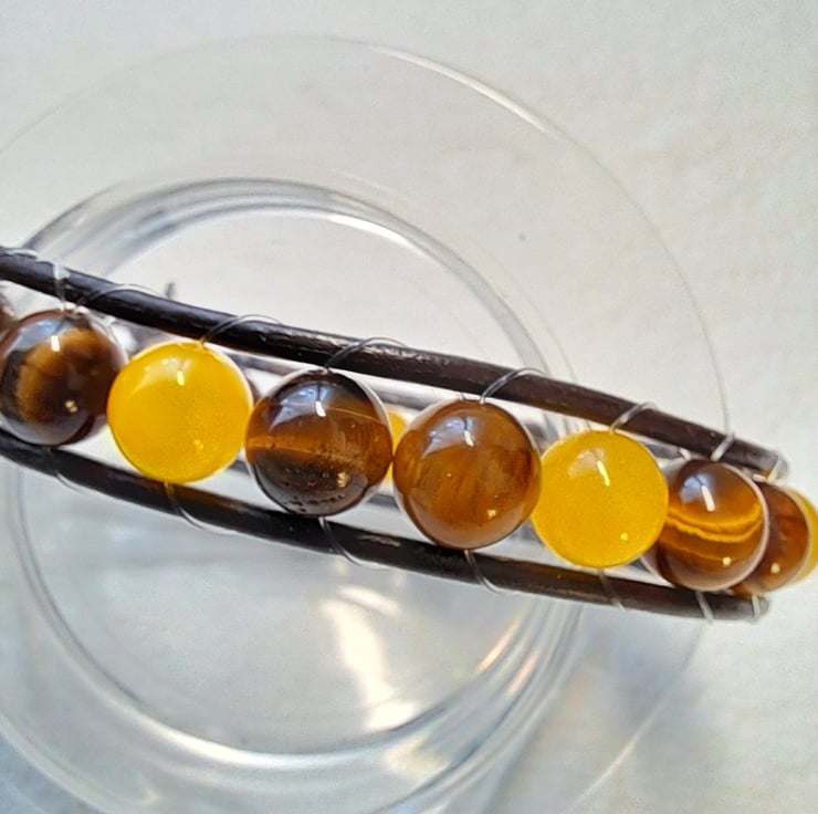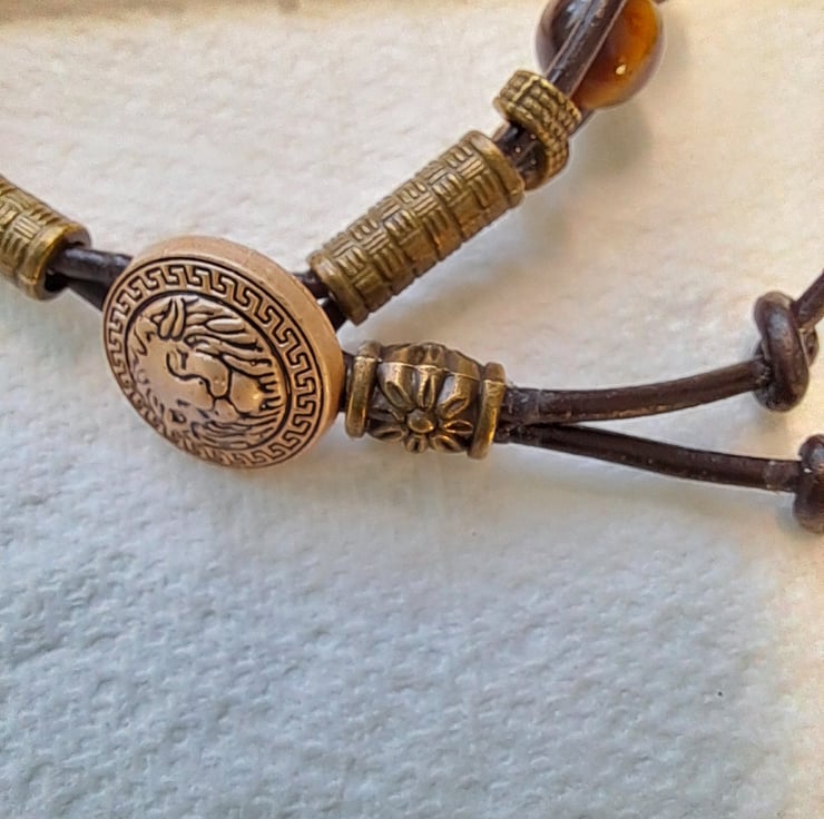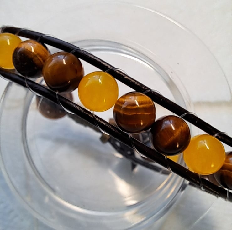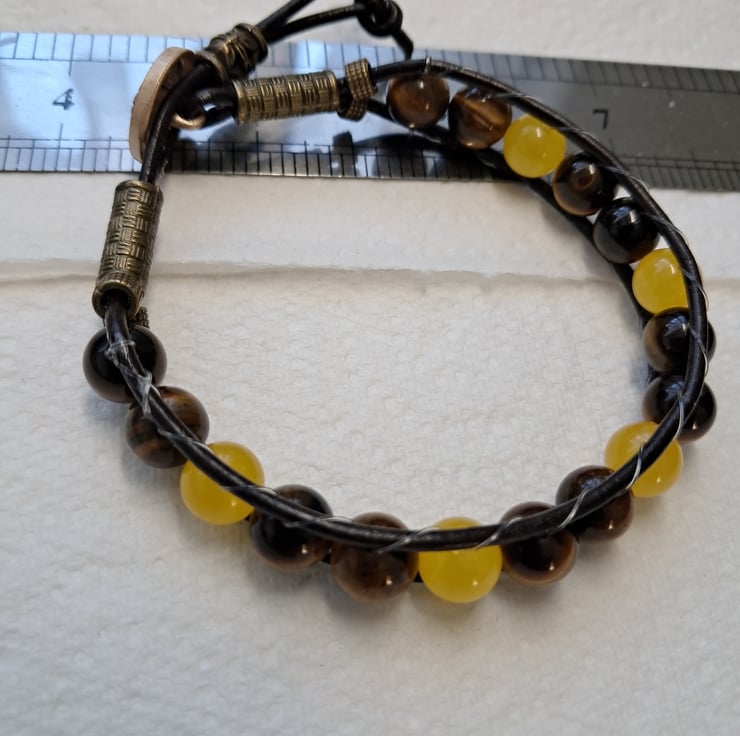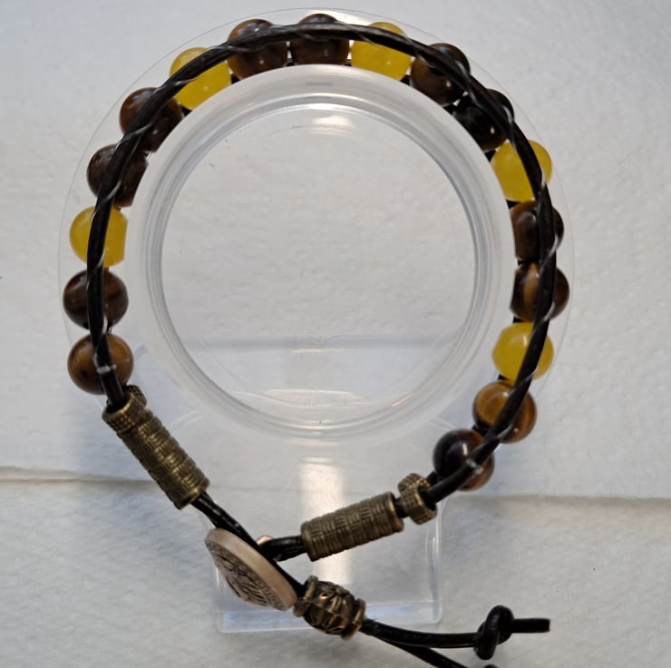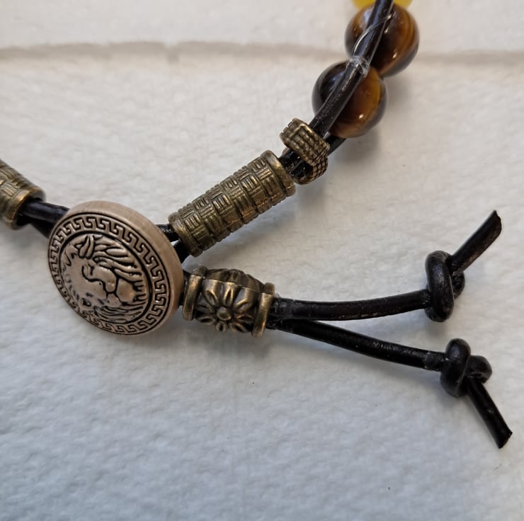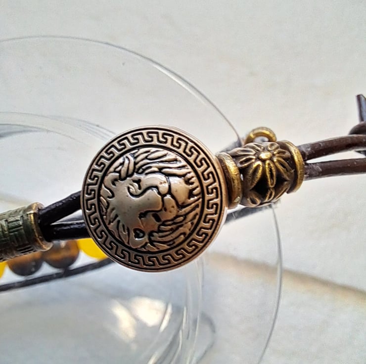 Leather Wrap Bracelet with 8mm Natural Tigers Eye and Yellow Jade beads on 2mm Dark Brown leather cord. Bronze tone endings with Lion Head round button fastener. Will fit up to 7" wrist. Handmade. Thankyou for looking. Lori