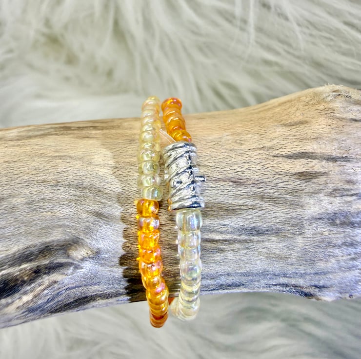 This long bracelet is designed to be twisted and doubled up to give a two tone effect. In neutral tones of subtle orange and cream with a metal spacer.