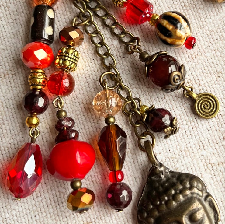 It's made with an eclectic mix of berry-coloured glass beads plus carved hua jade, garnets, carnelian, horn and ceramic. I've used a selection of tibetan-style metal spacers and bead caps.