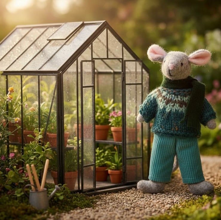 Walter Woodstock, in his turquoise corduroy trousers, teal and turquoise yoked jumper and teal scarf, is a Little Nipper. Little Nippers are tiny wood mice who live in a maze of tunnels underneath the barn at Mulberry Farm. All of the Little Nippers are named after herbs and meadow flowers. Littlenippers are 12cm tall. Clothes made especially to fit them are also available in my shop.