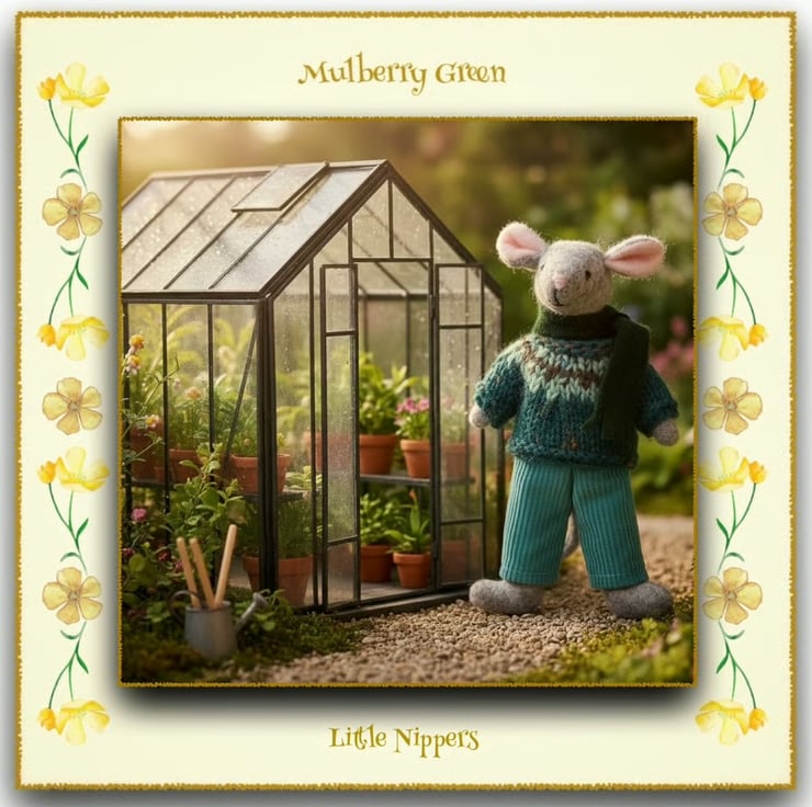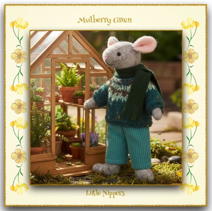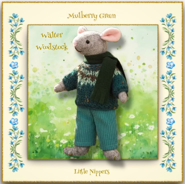 Walter Woodstock, in his turquoise corduroy trousers, teal and turquoise yoked jumper and teal scarf, is a Little Nipper. Little Nippers are tiny wood mice who live in a maze of tunnels underneath the barn at Mulberry Farm. All of the Little Nippers are named after herbs and meadow flowers. Little Nippers are 12cm tall. Clothes made especially to fit them are also available in my shop.