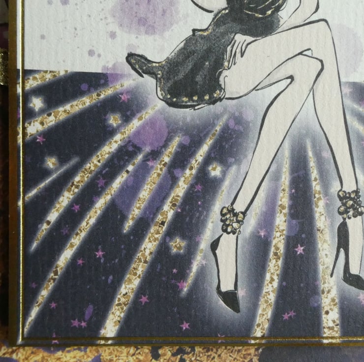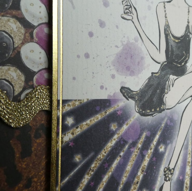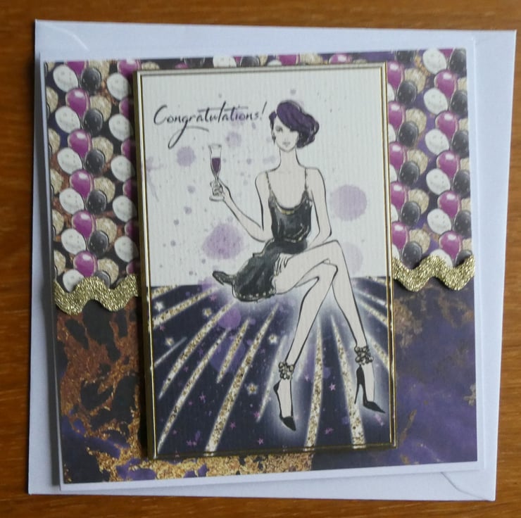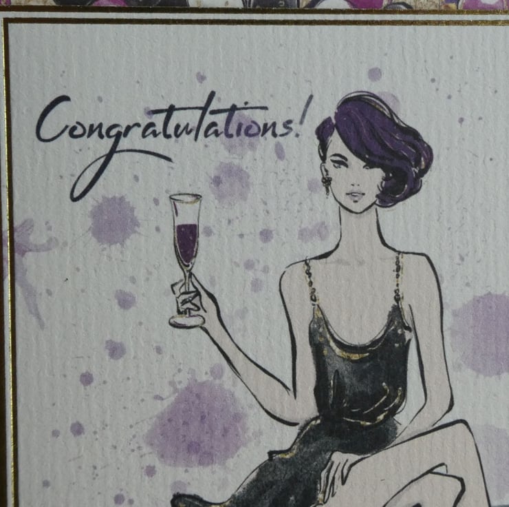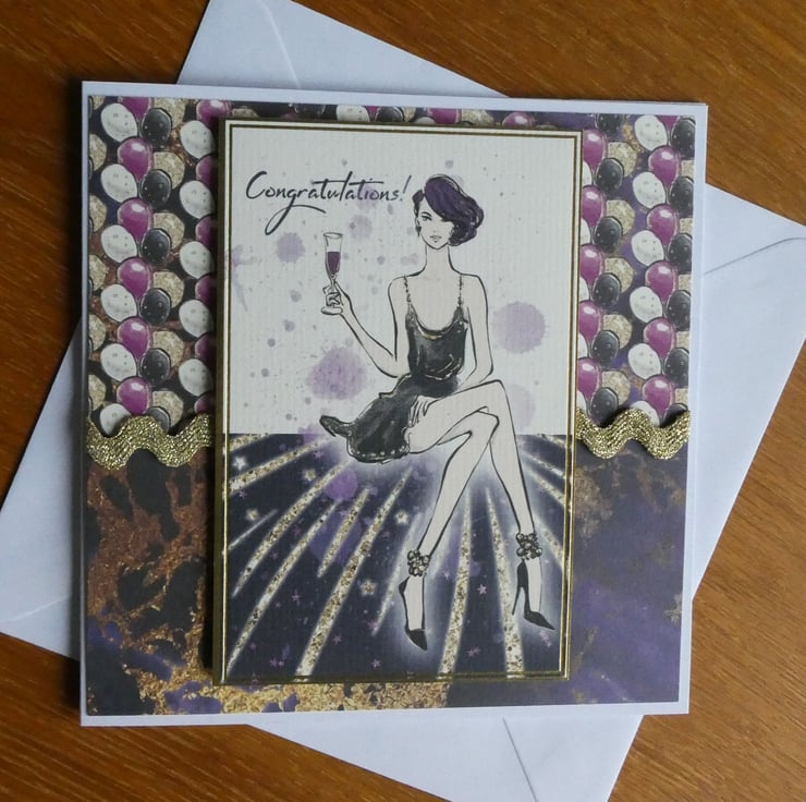 The main focal image of an elegant young lady holding a glass and with the message Congratulations! has been mounted onto background card in 2 co-ordinating patterns, one with purple, black, gold and white balloons and the other with an abstract gold design on a dark purple background.