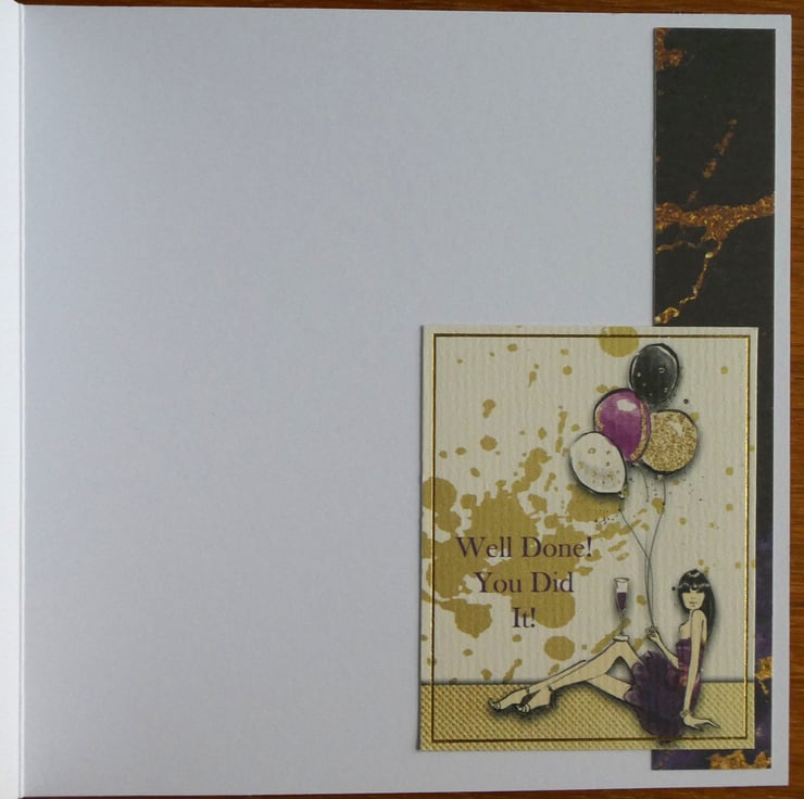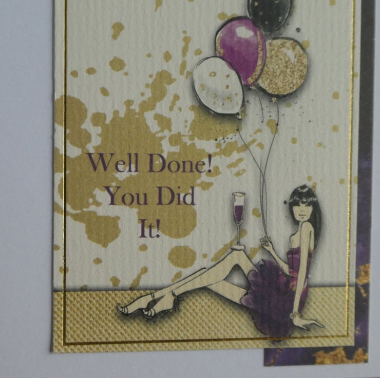 Inside the card a strip of matching purple and gold card has been added down the right hand edge with a smaller image at the bottom showing a young lady holding a bunch of balloons and with the message 'Well Done! You Did It'.