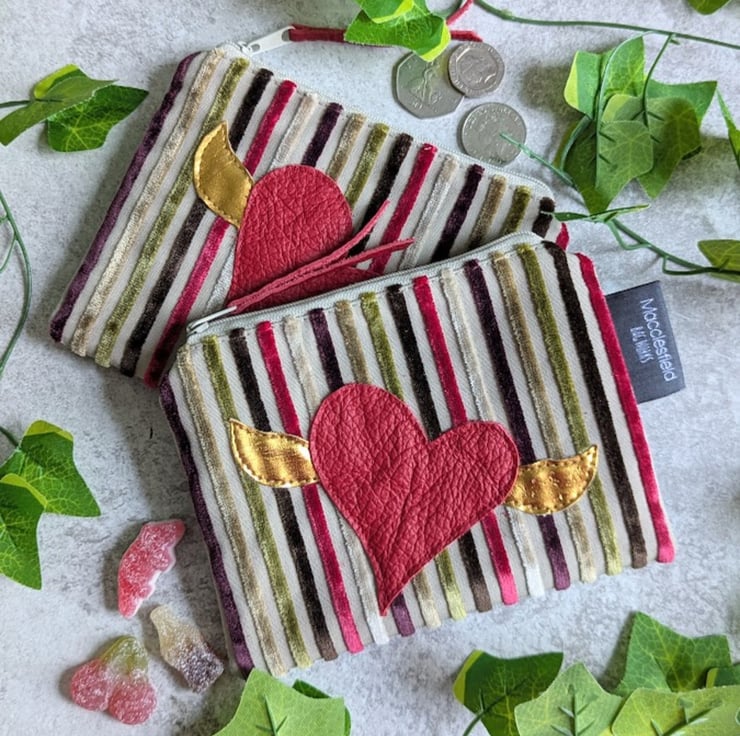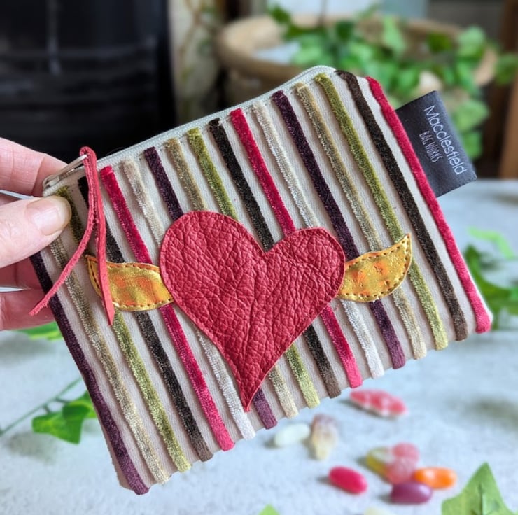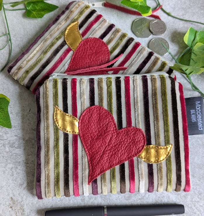 Designed as a purse, but could also be used as a small make-up bag or to hold those little bits and pieces in your bag. Inside, the purse has been lined with a leopard print cotton drill, it has a hand appliqued design featuring a red leather heart and gold cork fabric wings. The purse has a light beige zip with a red leather zip pull.
