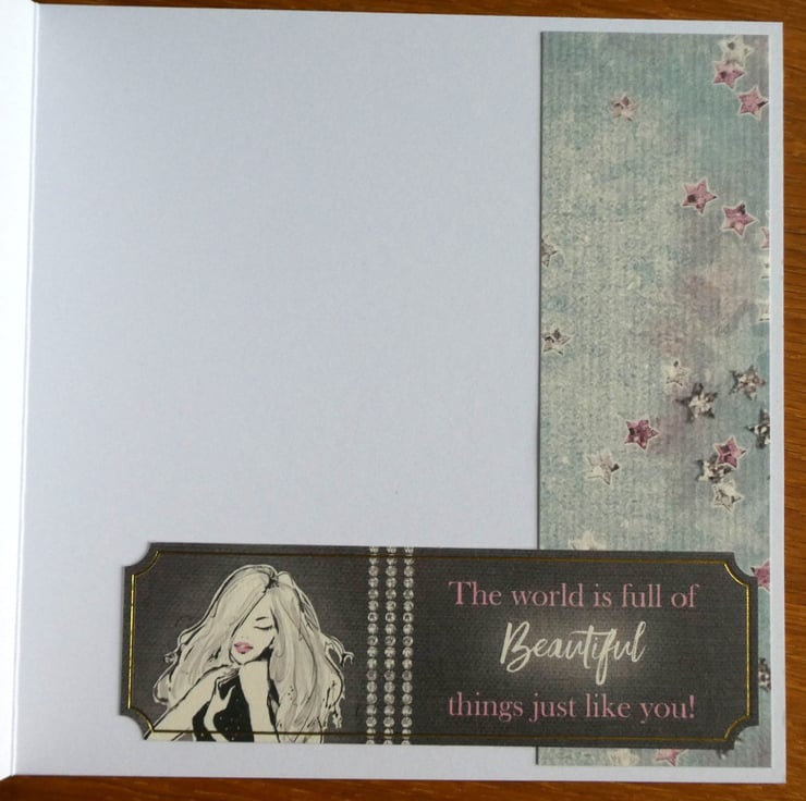 Inside the card a strip of matching star patterned card has been added down the right hand edge with a further message with the words 'The world is full of Beautiful things just like you!'.