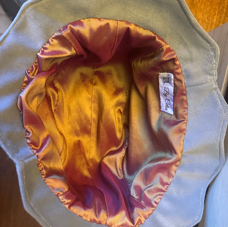 My vintage style, cloche flapper hat is made from soft grey velvet with a shot taffeta gold lining.
