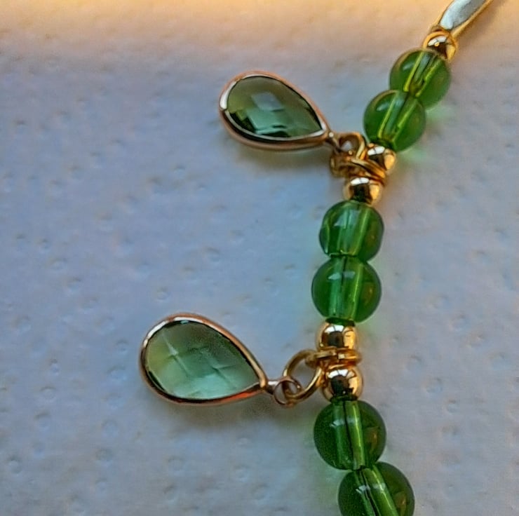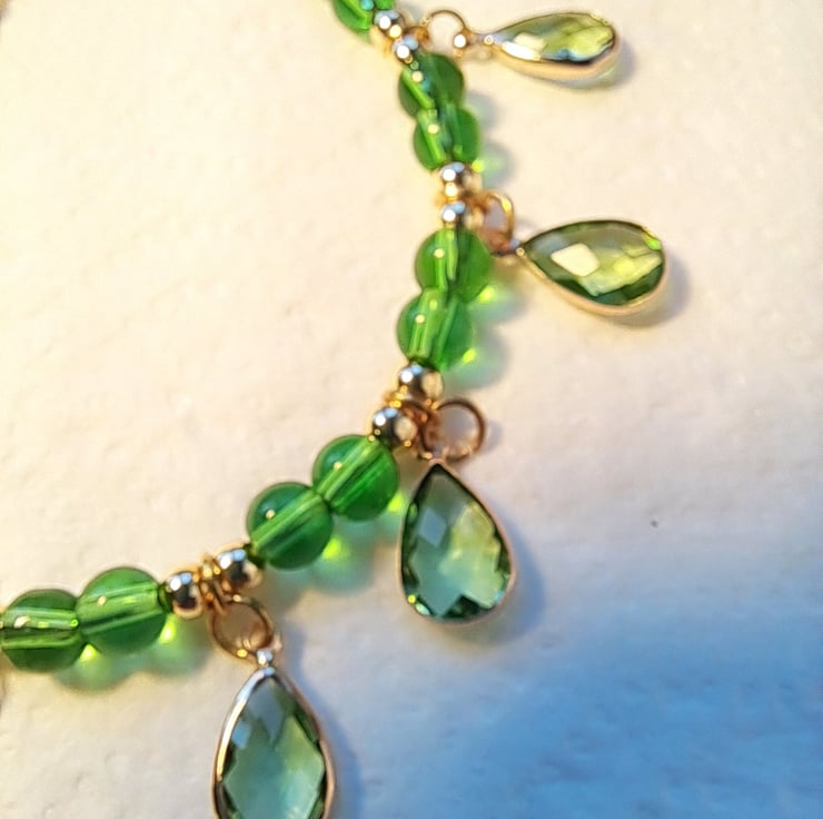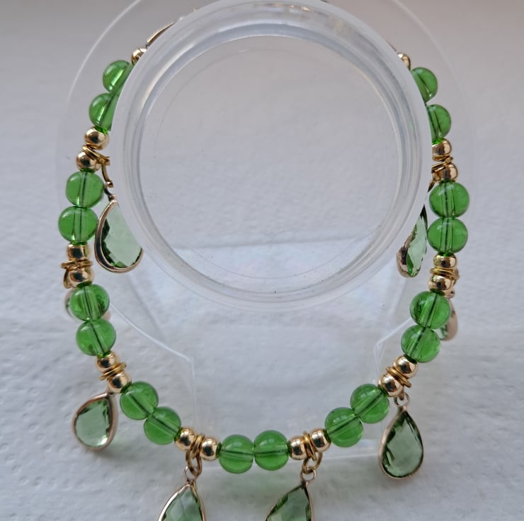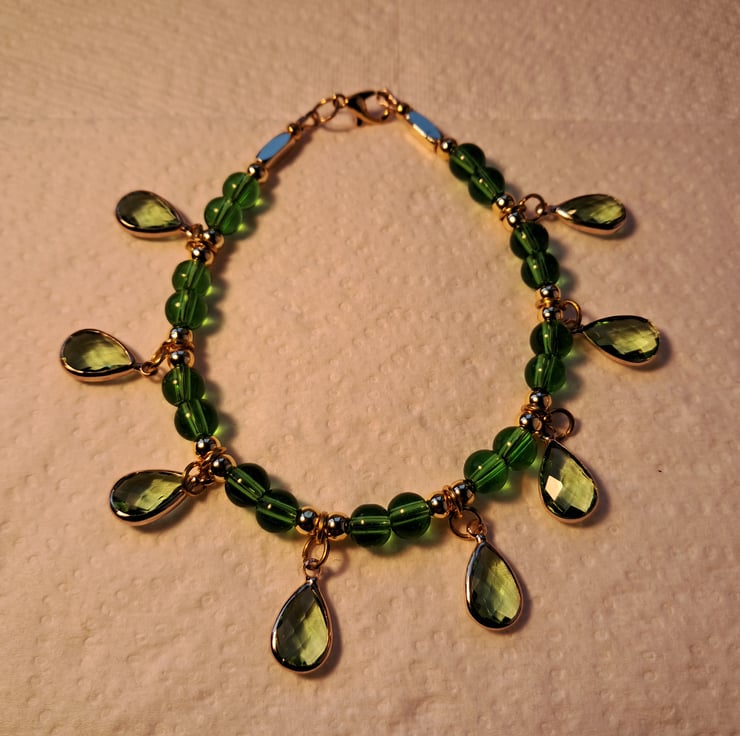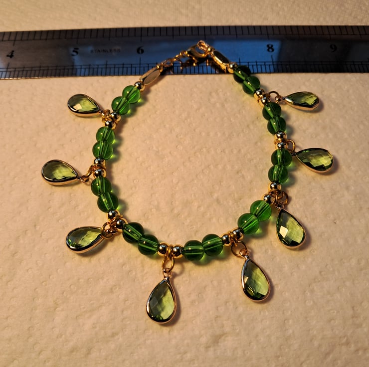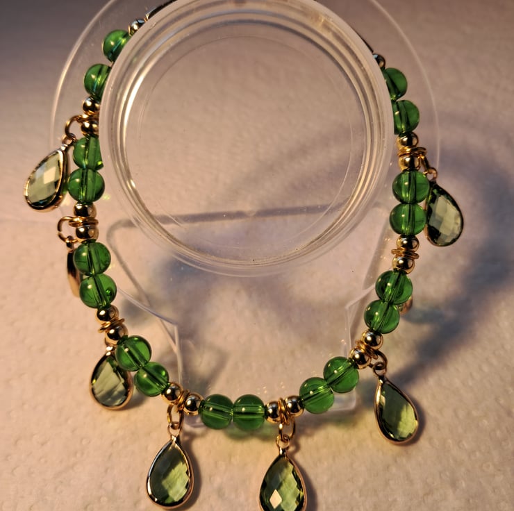 Raindrop Bracelet on wire with 10mm faceted raindrops with gold tone surround, 6mm round Peridot colour Glass beads and 3mm gold spacers with gold tone endings with Lobster Claw fastener. Will fit up to 7.1/2" wrist. Handmade. Thankyou for looking. Lori