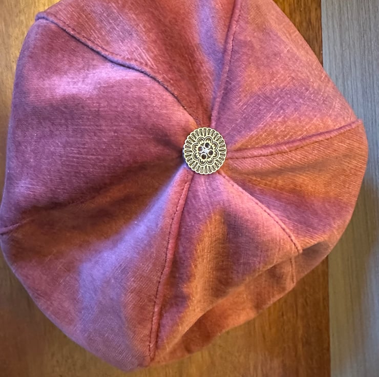 My jaunty, beret style hat is made from russet velvet with a lining of gold taffeta. It is designed to fit a 23ins or 58cm head and has elastic for a comfortable fit.