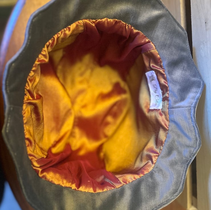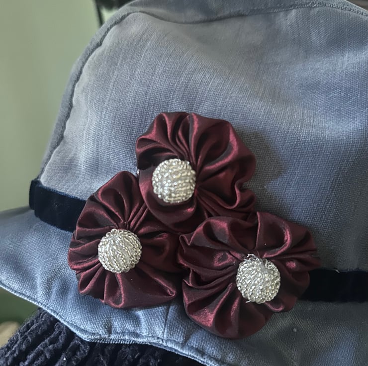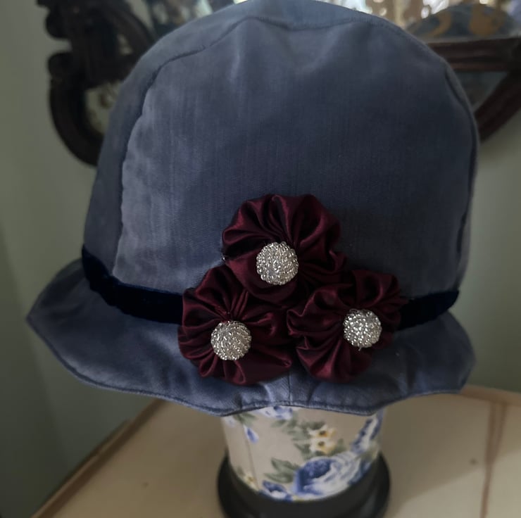 My 1920's style flapper cloche hat is made from soft blue velvet with a gold taffeta lining. It is trimmed with a navy blue ribbon and decorated with three red taffeta rosettes and silver beads.
